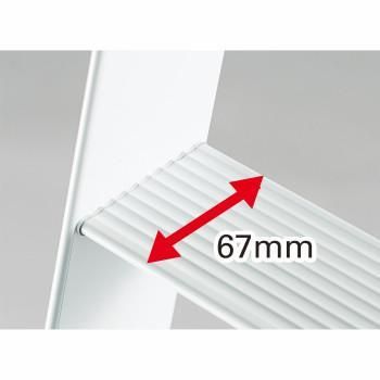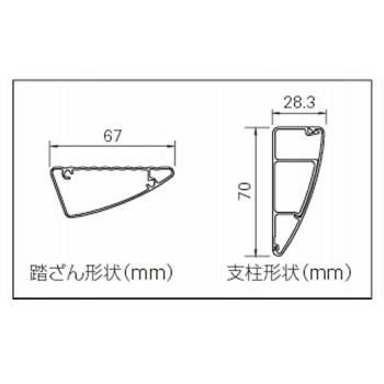 高さに応じて変更できるフック取付け位置(2段階)。フックは2ヶ1セット標準装備です。踏ざんの表面は滑りにくい波形を採用しています。支柱の断面を四角から三角に変えることで、すっきりとしたフォルムと握りやすさを実現しています。グリップ性の高いエラストマー素材の滑り止め用端具です。