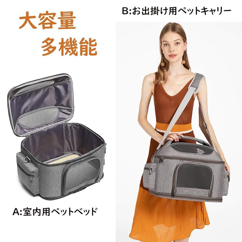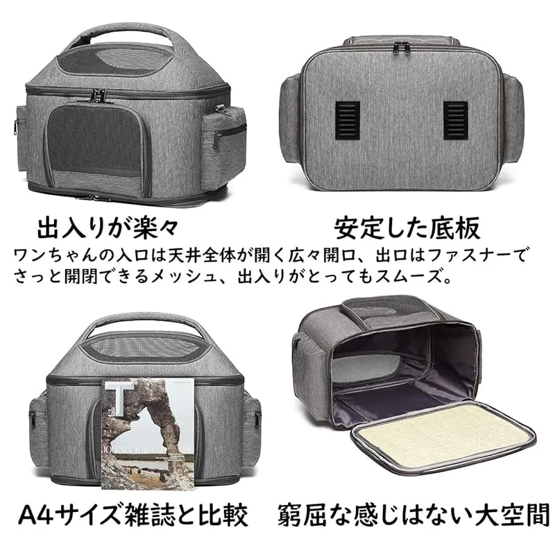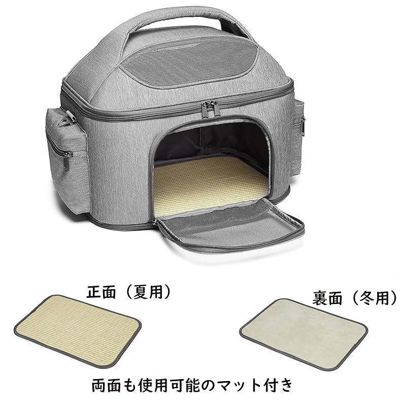 「キャリー本体にもこだわりました。」中の広々としたスペースをしっかり確保。ワンちゃんとニャンコはゆったりでき、移動中ものびのびとできます。キャリーの両サイドにポケットがあり、お出かけ用におもちゃやおやつなどを入れられます。両面使用可能のマット付き、季節に合わせて変えられます。メッシュ素材で通気性拔群 底面滑り止め付き。