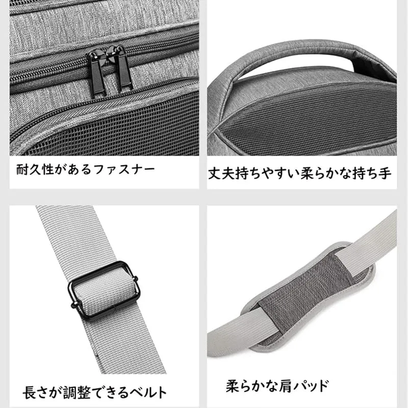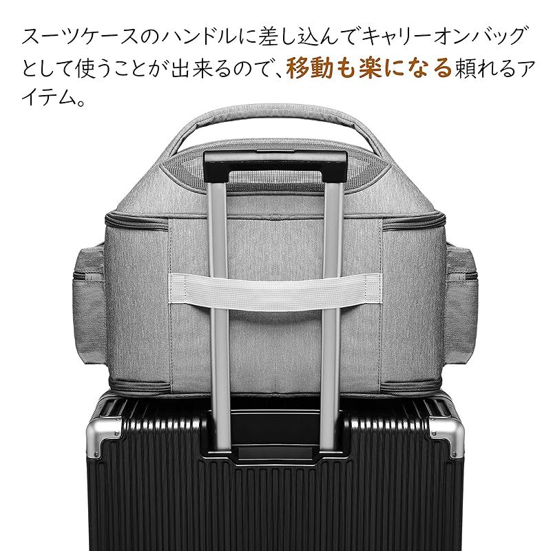 「3WAYペットキャリー」肩掛けできるショルダーベルト付きです。(ポケットに入っております。)丈夫持ちやすい柔らかな持ち手付き、肩掛けでも、手持ちでも痛くなりにくいです。スーツケースのハンドル部分にセットすればキャリーオンバッグに早変わり、移動も楽になる頼れるアイテム。
