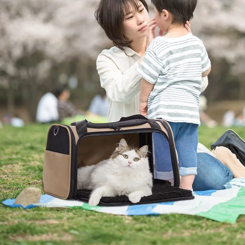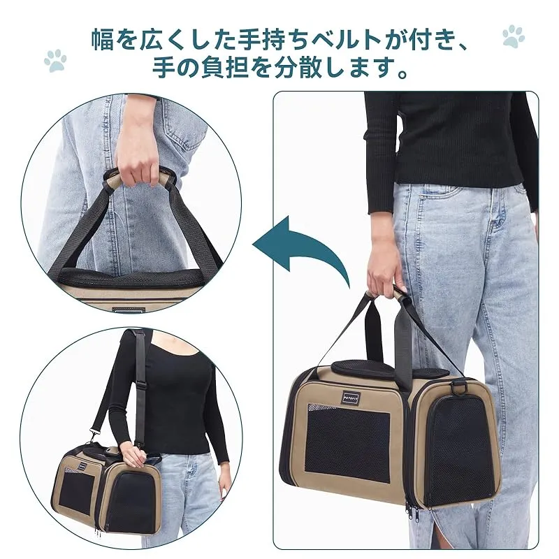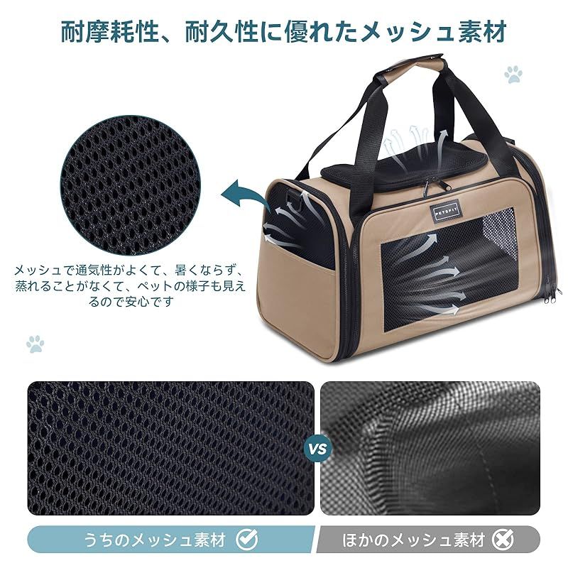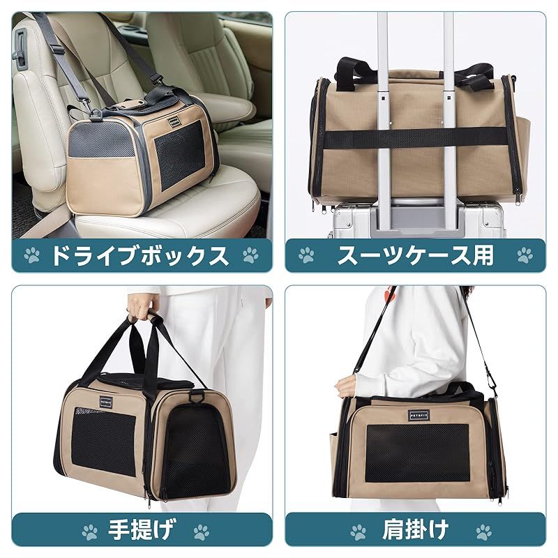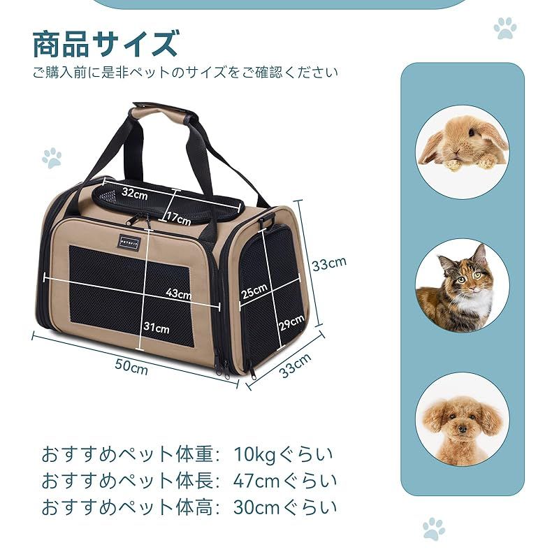 商品名:PETSFIT 犬 キャリー バッグ 猫キャリー 中・大型猫用・小型犬・うさぎ用 飛び出し防止リード付き 車載/ドライブ/キャンピング/旅行/通院/災害避難用 カーキ XLサイズ