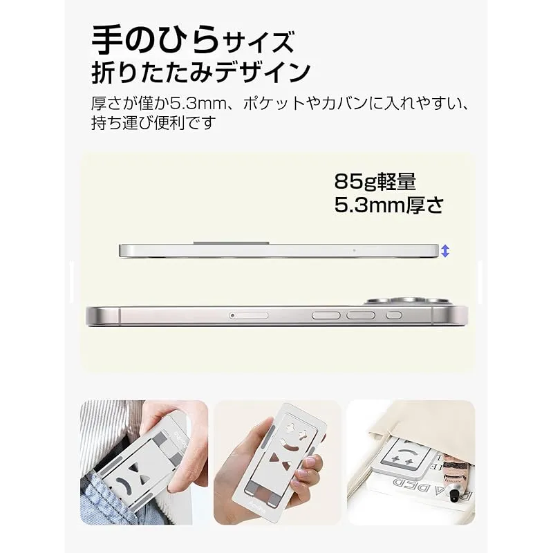 【幅広い対応性】この携帯スタンドは、軽量でフラットに折り畳めるため、持ち運びやすさと使いやすさを兼ね備え、日常の動画視聴や電子書籍の閲覧、オンライン会議など、幅広いシーンで活躍します。例えば、出張や旅行などの移動中でも、新幹線や飛行機内でサッとスタンドをセットして、両手を解放しながら快適に動画や映画を楽しめます。また、コンビニやレストランでの一時的な利用から、デスクワーク時のビジネスミーティングやビデオ通話まで、さまざまな用途に対応。スタイリッシュで機能的なデザインは、モバイルワーカーやフリーランスにもぴったりです。