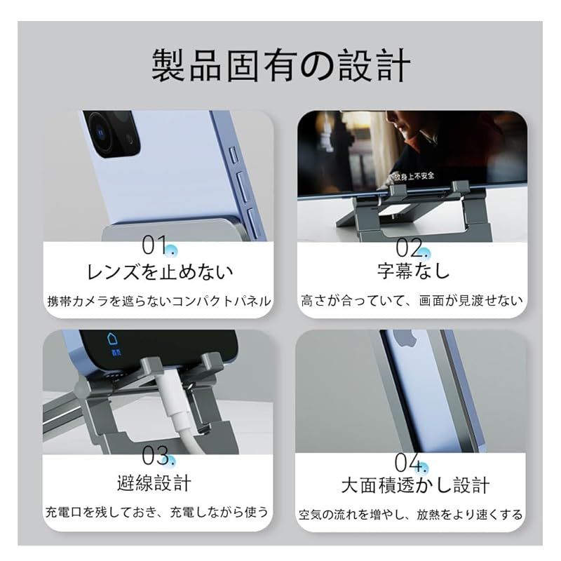 商品名:折りたたみ可能スマートフォンスタンド 角度調整可能 アルミニウム合金材質 コンパクトで携帯可能 充電可能 デスクトップスタンド iPhone Androidスマートフォンに適し 12インチ以下の携帯電話(グレー)に対応