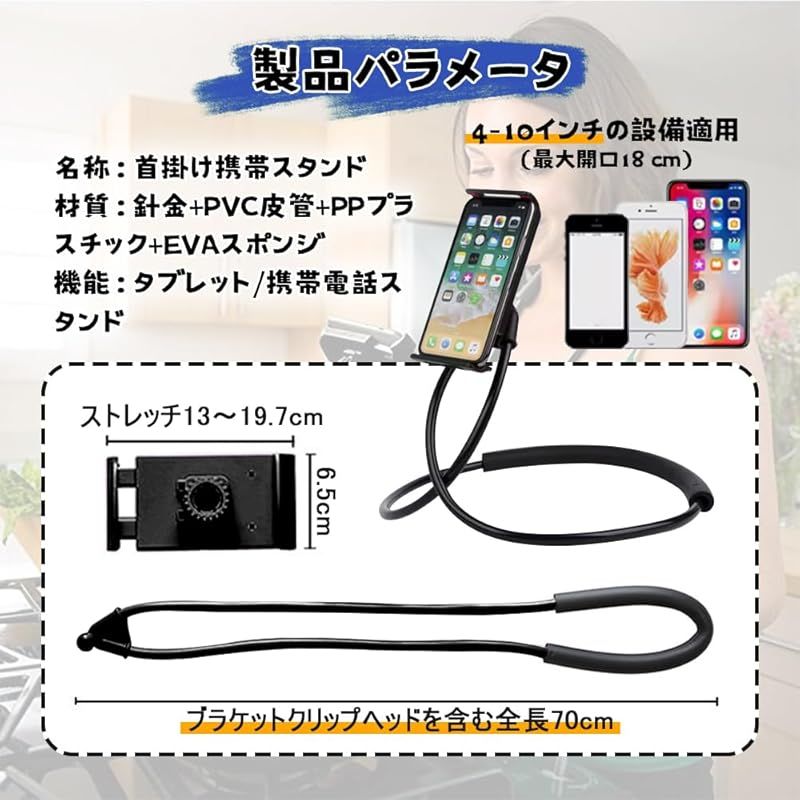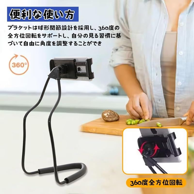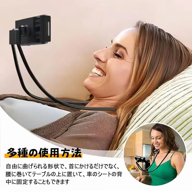 【多種の使用方法】ブラケットアームは自由に曲げて造形することができて、首に掛けることができるだけではなくて、腰の間に巻いて、デスクトップに置いて、ベッドフレームあるいは自動車の座席の背中に固定することができます。ビデオを見ても、読んでも、歌を聴いても、撮影しても、便利な体験ができます。