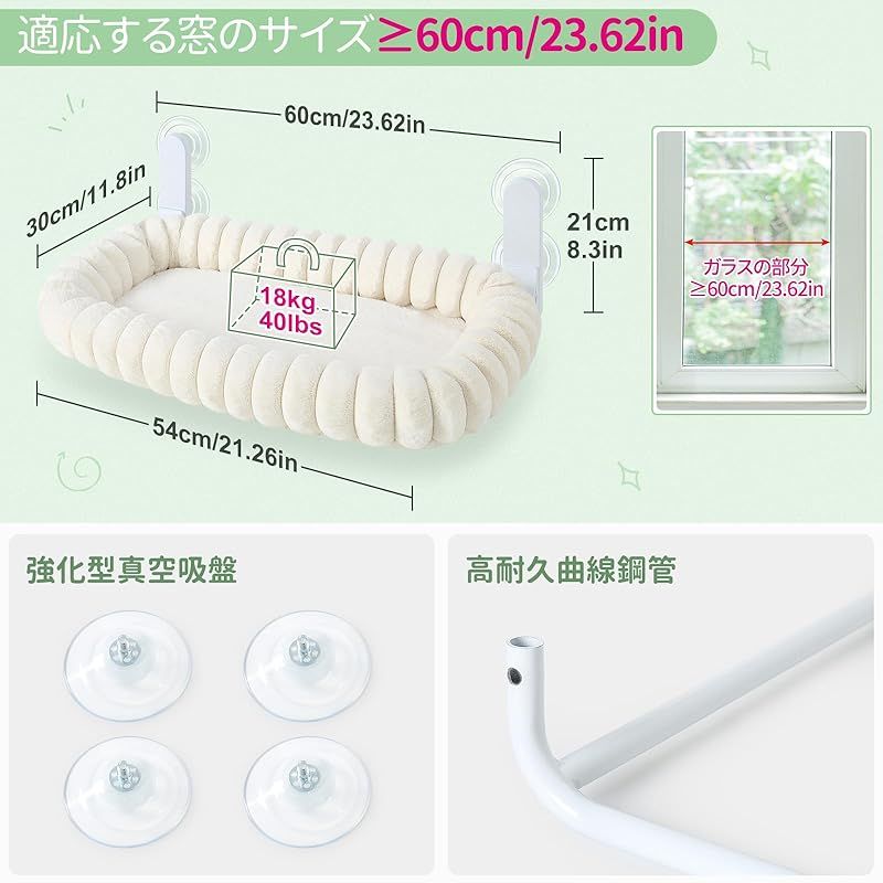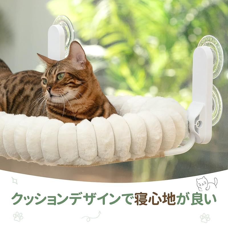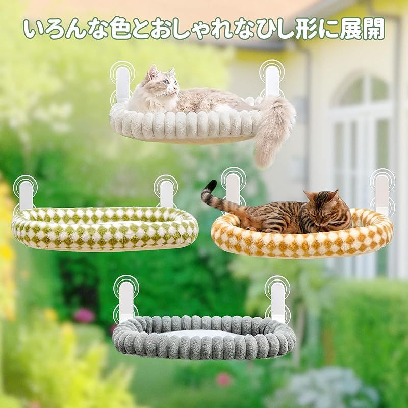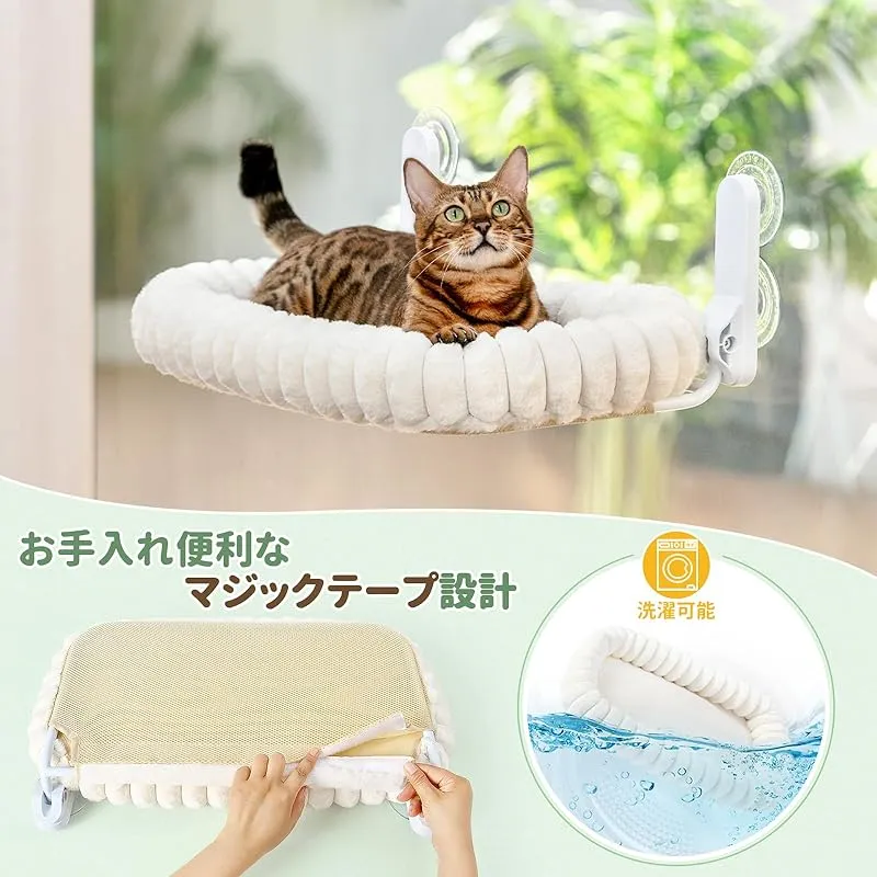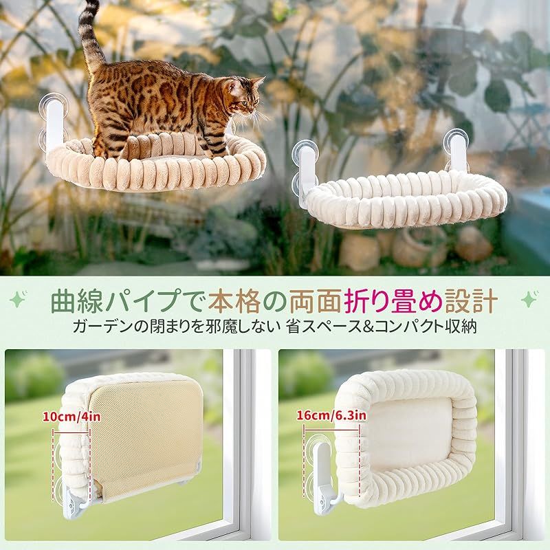 【クッション付き折り畳み式猫ハンモック】 大人気な折り畳み式ねこハンモックに新たなデザインを開発 クッション付きで両面使用可能で カーテンの閉まりを邪魔しない折り畳みデザイン 、使用しない時スペースを節約 2側の枠の吸盤を2倍に、吸引力を大幅アップ !。 耐荷重は18KGに進化!猫二匹でも落下の心配がいりません。 取り外せやすいマジックテープ固定のカバー、丸洗い可能でいつも清潔に保ちます。