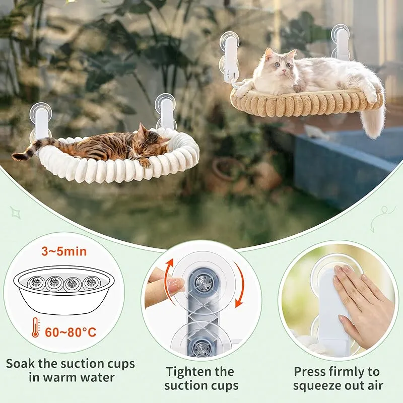 【2倍の吸盤で吸引力UP】直径8.3cmの大型吸盤4つで作動。従来上下分けの吊りタイプより受け力を2倍up!最大耐荷重25KGにアップため、ニャンコが強く飛び乗りでも大丈夫。万が一一つ緩めても吊りタイプと違い、落下する恐れがありません。