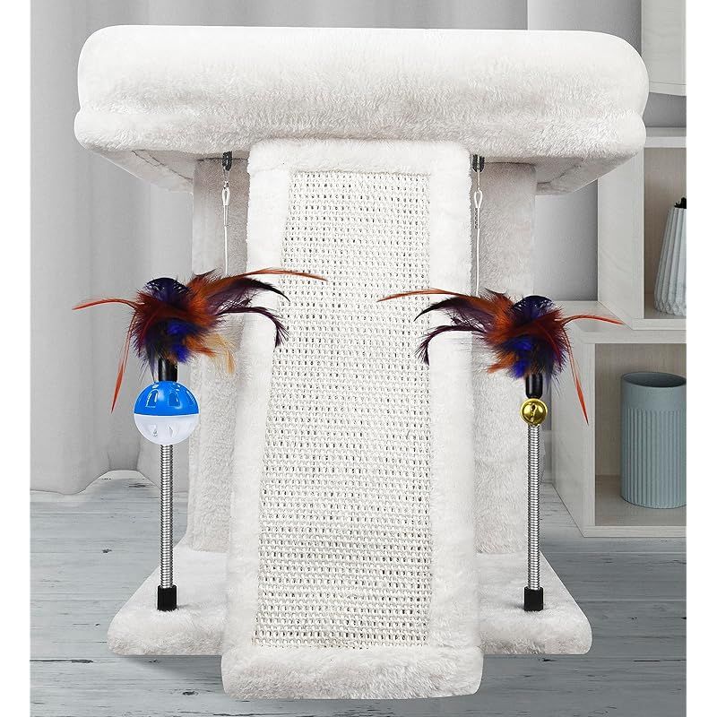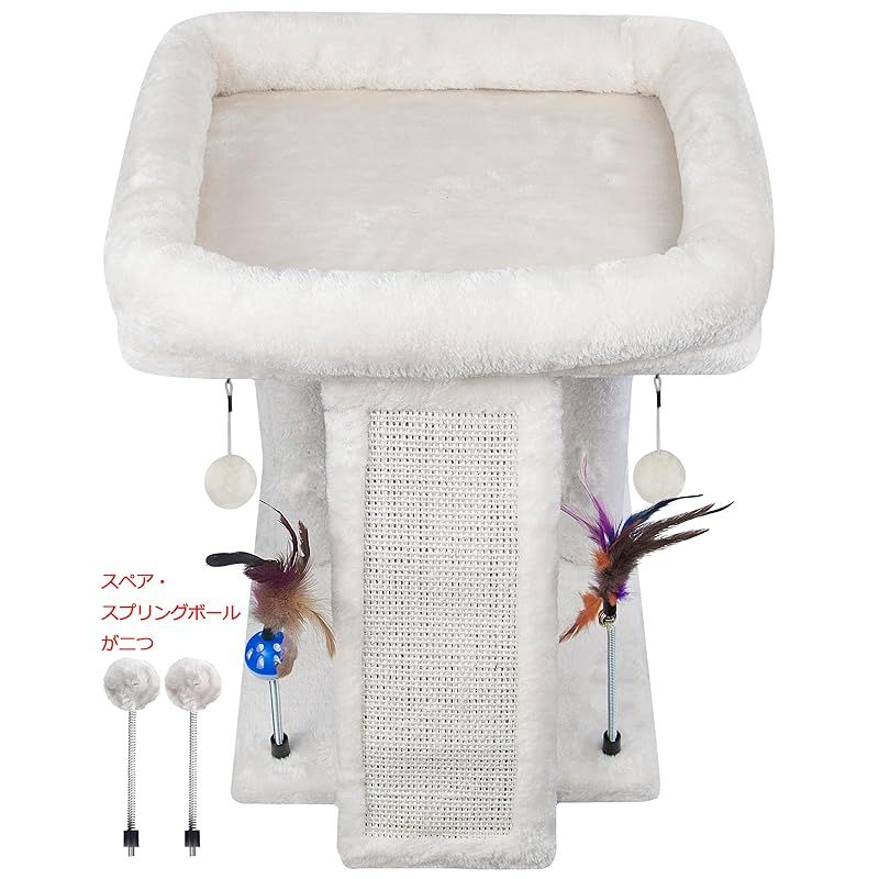 コンパクトのキャットタワーですが、爪とぎ板、猫パンチ用の吊り下げとスプリングボール、くつろげる高台、快適に過ごせるポイントが満載!