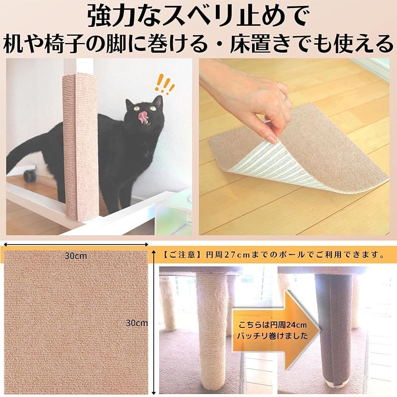 【キャットタワーDIYや床置きでも使えるオールラウンダー】裏面のスベリ止め加工により木材に直接巻き付けてもガッチリホールドしてズリ落ちません。床に置いてもズレないので床で爪研ぎ派の子にもお使いいただけます。