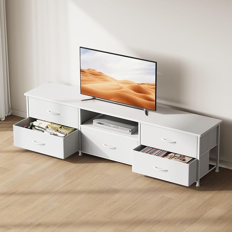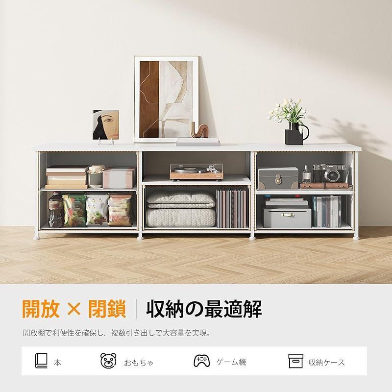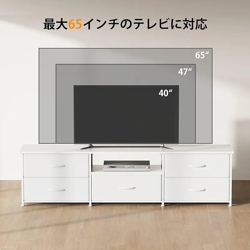 5 つの独立した引き出しと 1 段のオープン棚を備えた「55 型対応」テレビ台は、豊富な収納機能でリビングの雑然を解消します。引き出しではリモコンや小物を整理、オープン棚ではゲーム機、AV 機器、ビデオカセットレコーダーなどを使いやすく配置でき、空間を効率的に活用できます。