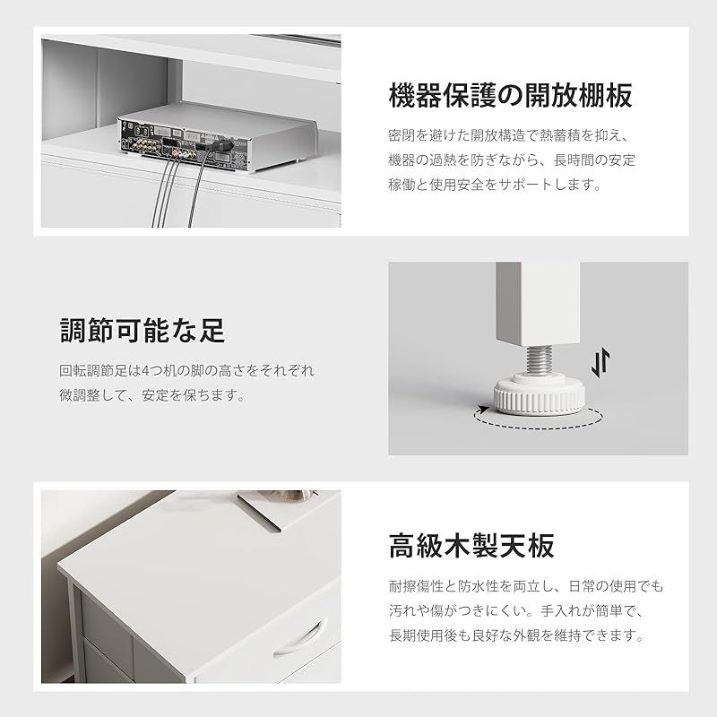 「55 型対応」ローボードテレビ台は、防水・耐磨耗性の高い高品質?面を採用。汚れが付いても簡単に拭き取れ、長期間清潔に保てます。底部調節脚で不陸にも対応し、機器を水平に固定。1 段のオープン棚で配線整理がスムーズで、AV 機器の放熱も促進し、機器の長寿命化に役立ちます。