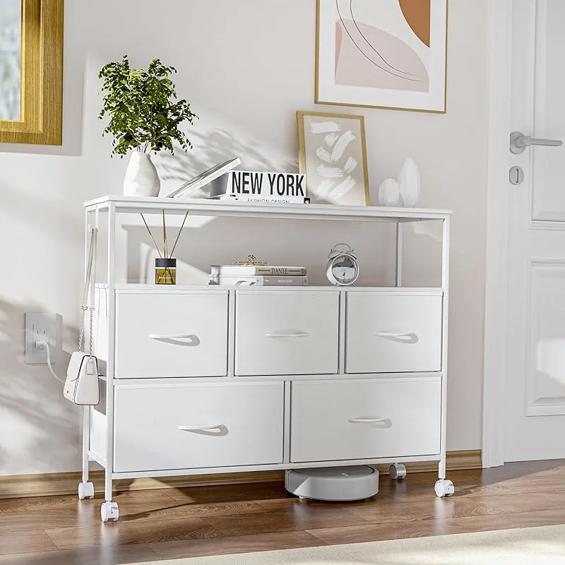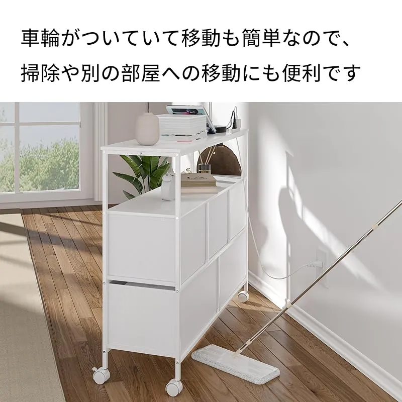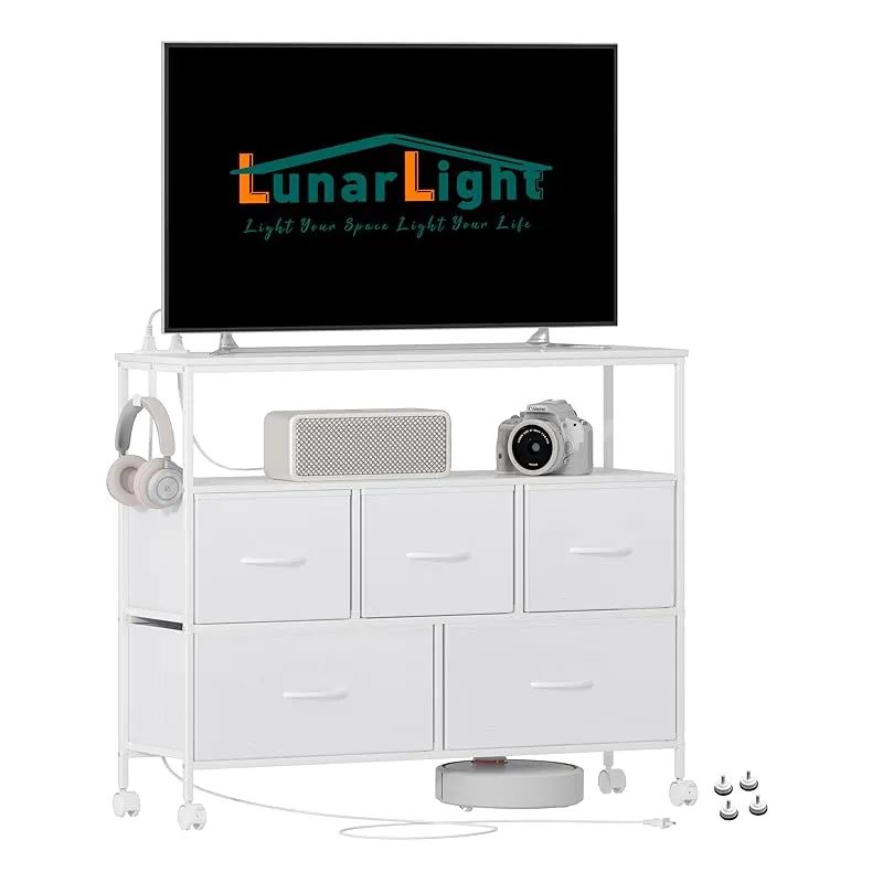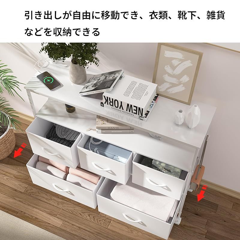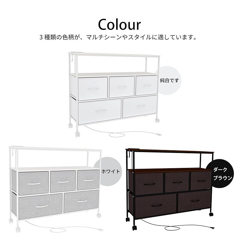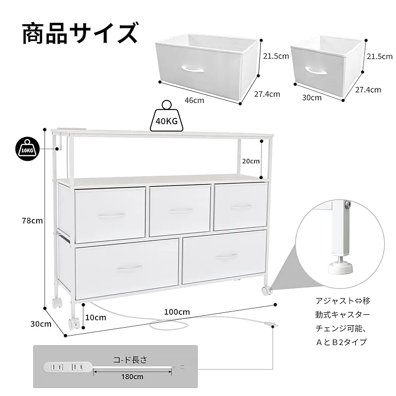 商品名:LunarLight チェスト タンス 幅100奥行30高さ78 収納チェスト 収納ケース 2口コンセント付き キャスター付き ストッパー付き 移動式と固定式2種類 テレビ台 頑丈 組立簡単 耐震転倒防止 大容量収納 引き出し2段5個 棚板2枚 (真っ白)