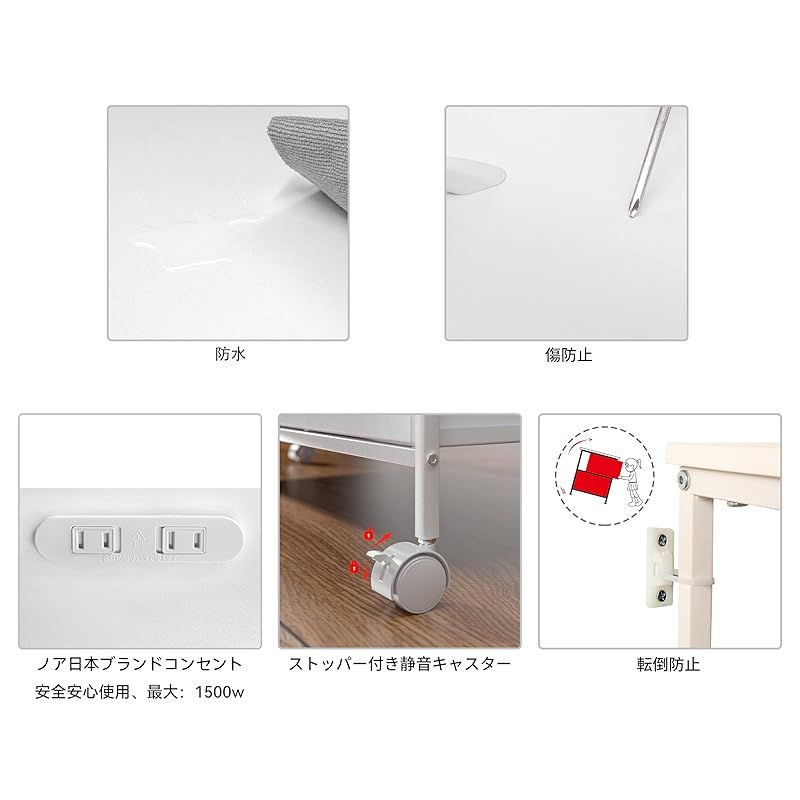 【安全構造】スチールフレーム+厚手木製天板・棚板の組み合わせで、抜群の耐久性が得られます。ストッパー付きキャスターと耐震転倒防止パーツが付属しているので、安全性が万全で、安心してお使いいただけます。木製部分は高耐久メラミン化粧板を採用し、熱・傷・汚れに強いので、汚れたらふき取りができてお手入れが超簡単です。耐摩耗・防水・耐熱性にも優れているので、長期間安定してご使用いただけます。