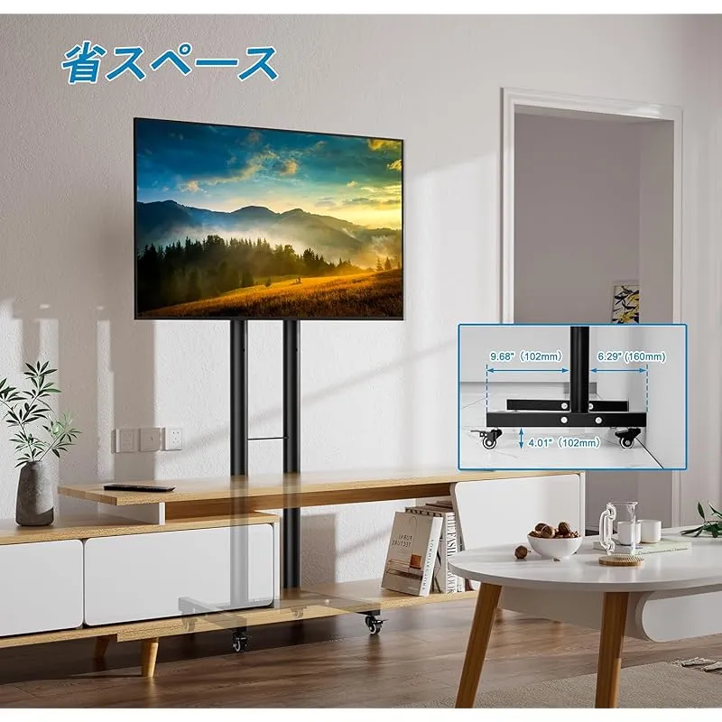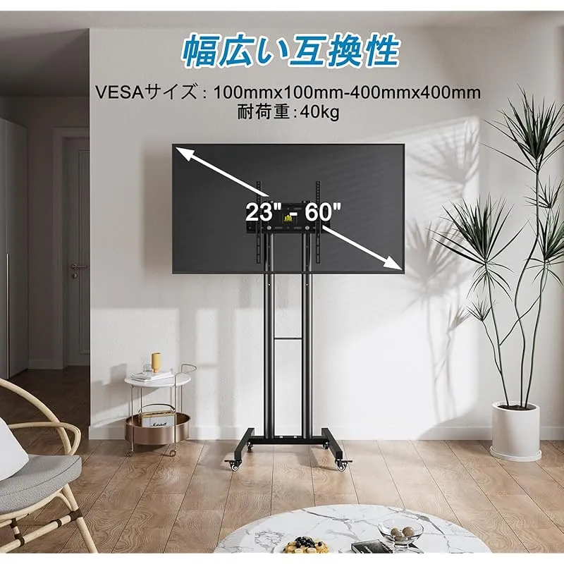【ユニバーサルテレビスタンド】移動式テレビスタンドは重量40kgまでのほとんどの23-60型のテレビに対応します。VESA規格(VESAはテレビ背面にある取付ネジ穴間の間隔)は400mmx400mmまでですが、100x100/200x100/200x200/300x200/400x200/300x300/400x300/400x400なども対応できます。ご購入前に必ずテレビのVESA、重量、サイズ仕様をご確認ください。