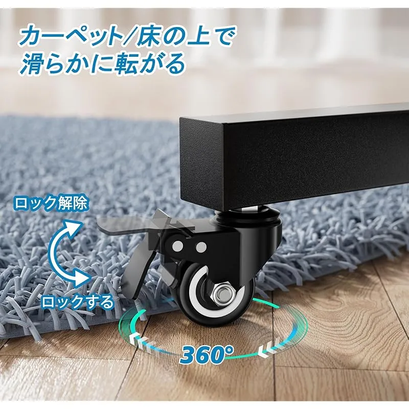 【ブレーキ機能付きキャスター】4つのキャスター付属しているため、一人でも簡単に移動でき、しゃがむことなく足で簡単にスタンド本体を固定することができます。