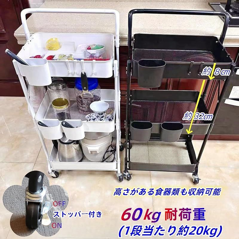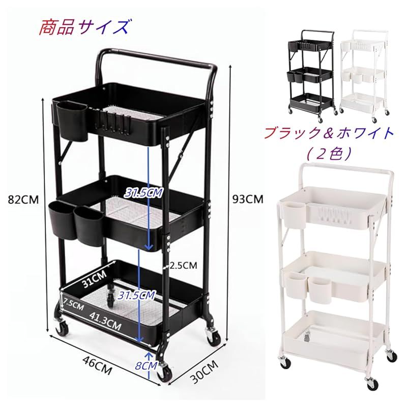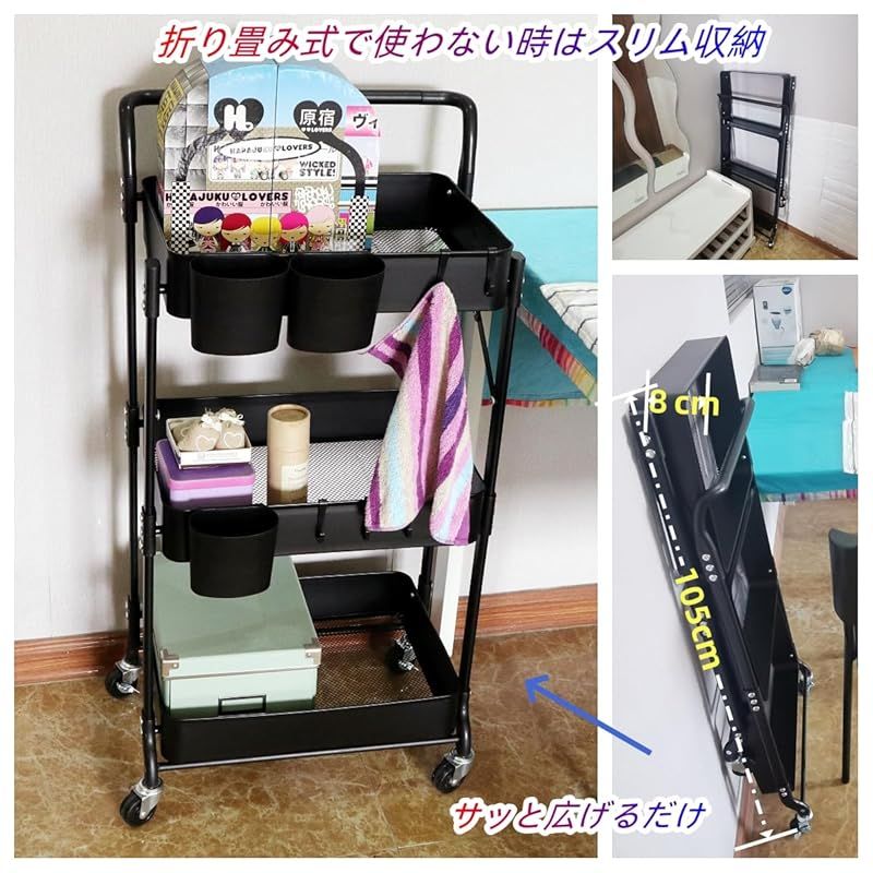 商品名:Secchuu キッチンワゴン 折り畳み 3段タイプ 耐荷重60KG 幅46cm×奥行30cm×高さ82~93cm シンプルさ 収納ワゴン スチール製ボデイ キャスター付き スムース移動 吊り下げカップとフック小物収納 組立商品 (ブラック, 折畳3段)