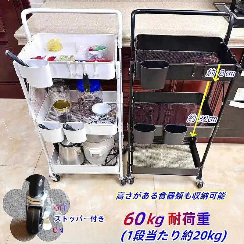 3段収納構造: 幅46cm×奥行30cm×高さ82-93cmの3段式で、キッチン用品や小物を整理整頓。各段には吊り下げカップやフックが付属し、小物収納にも便利です