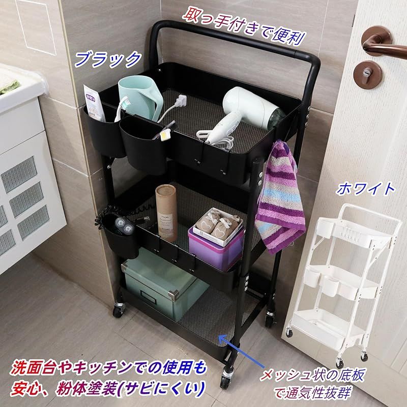 多目的収納ワゴン: シンプルな黒色デザインでどんなインテリアにもマッチ。キッチン用品だけでなく、バスルーム用品や文房具の収納にも最適です
