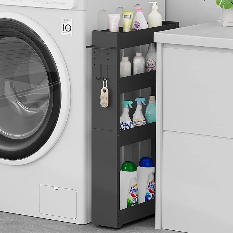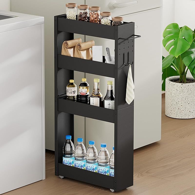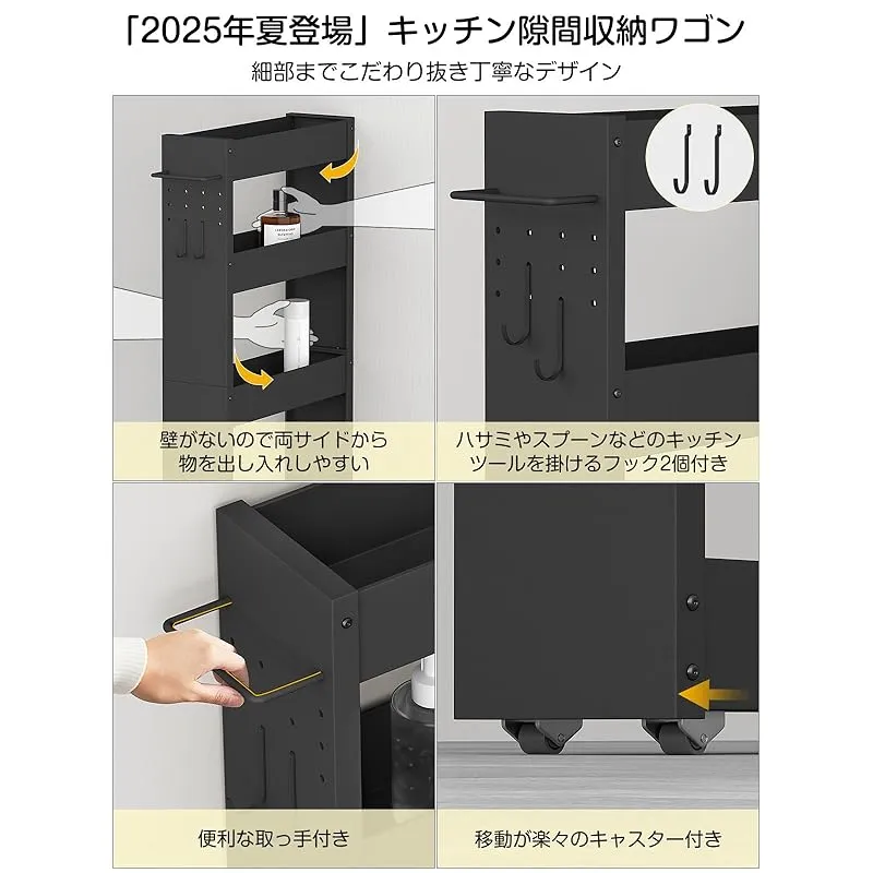 商品名:TKUIN すき間収納 ワゴン 幅13cm スリムトローリー キッチンラック 薄型4段 調味料 隙間ラック 冷蔵庫横 洗濯機横 洗面所 トイレ 小物 スチール 収納カート 耐荷重約32Kg ハンドル付き・隠しキャスター・フック2個 隙間収納ラック (ブラック)