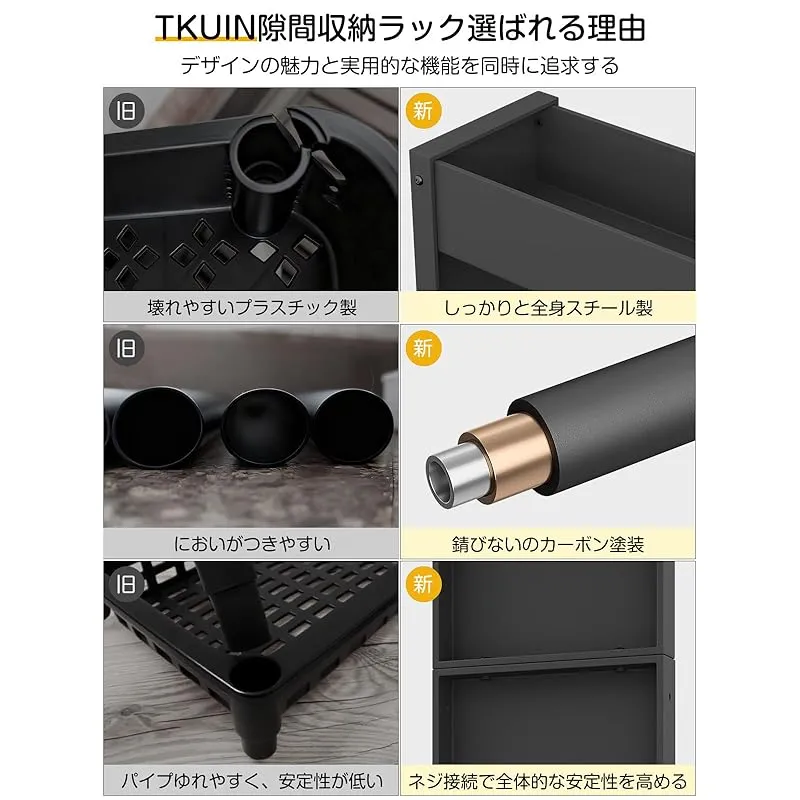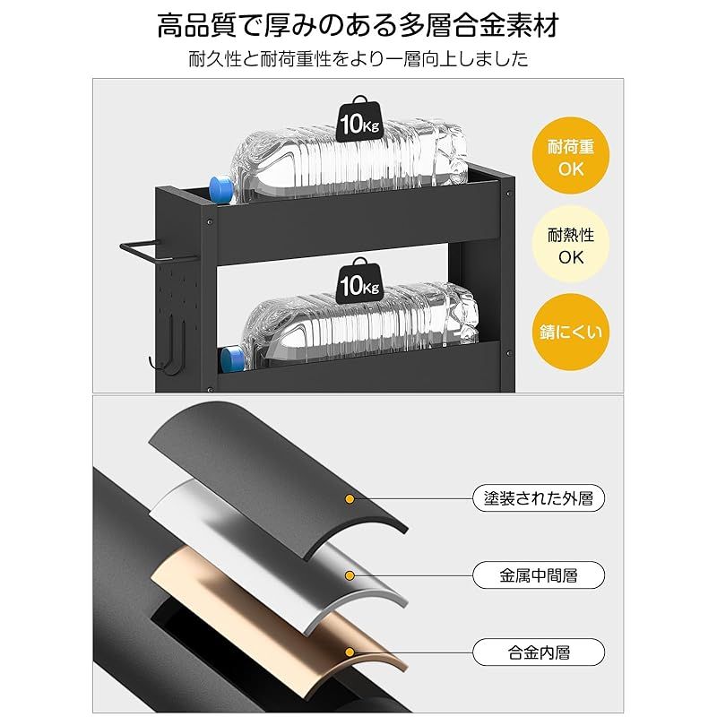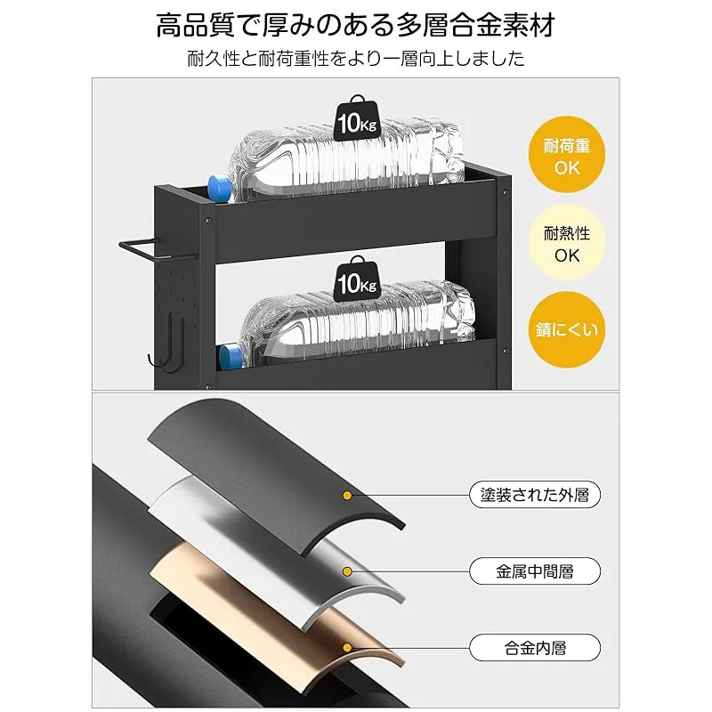 【高品質・高耐荷重・高耐久性】長く使えるよう、サビにくい粉体塗装が施されています。汚れてもサッと拭くだけでお手入れ簡単な隙間ワゴン。また、収納力だけでなく耐荷重やつくりも、調味料や洗剤など重たいものを保管できるスチール製の高品質頑丈な素材を使用しました。
