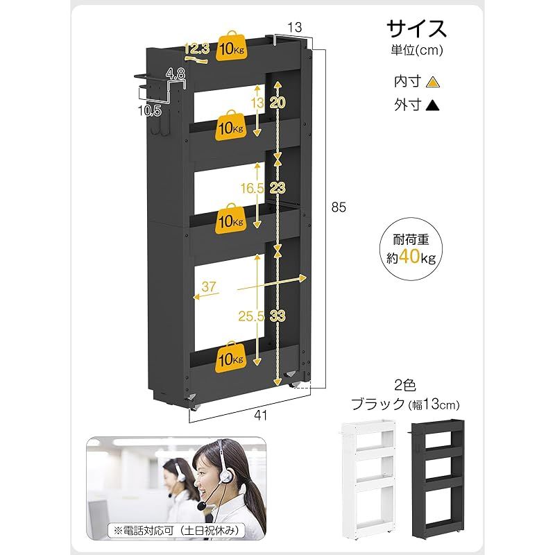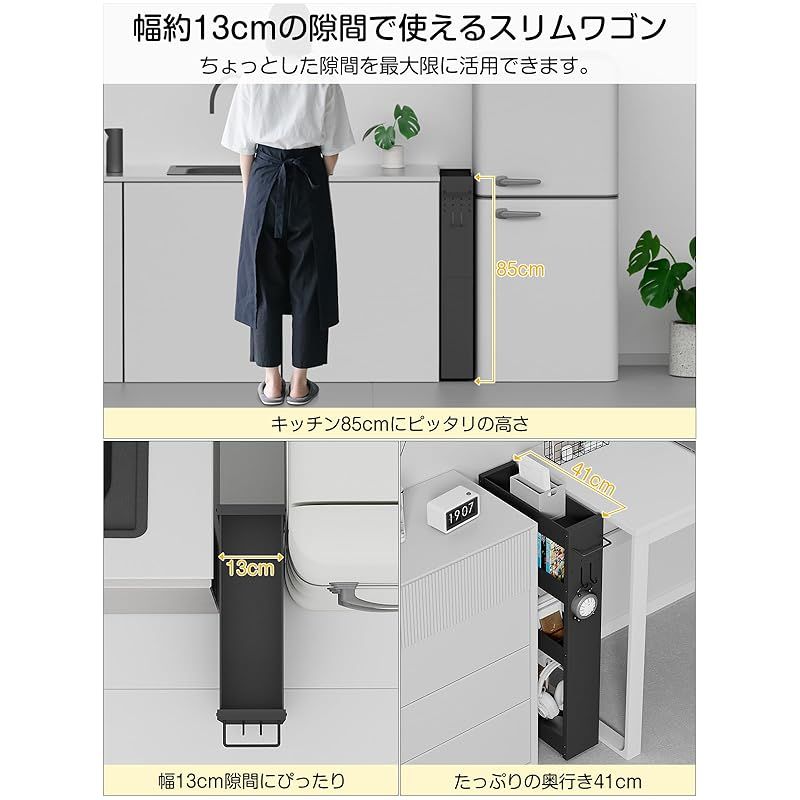 【スキマラック仕様】 サイズ:約幅13x奥41x高85cm。各層耐荷重約8kg、総耐荷重約32KG。本体重量約3.4Kg。材質:スチール。ちょっとした隙間を有効活用できるスリムな収納ワゴンです。