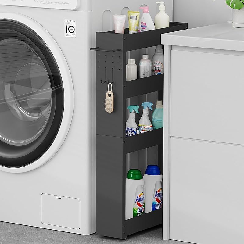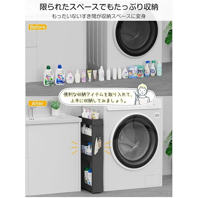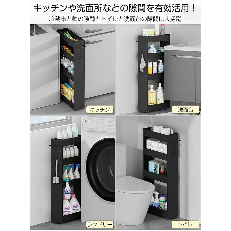 【多用途な収納ラック】 キッチン収納に:調味料や食品のストック置き場に。洗面台用収納に:ドライヤー、ヘアワックスやスプレーなど使用頻度の高いものは上へ、小さいものから詰め替え用のボトルや洗剤などを下に。トイレ収納に:トイレットペーパーロールやトイレ用洗剤、除菌シート、芳香剤から文庫本などを一括収納。ランドリー用収納に:シャンプーなどのストックや毎日使う洗濯洗剤や柔軟剤をキレイに片付けられる。シンプルなデザインで、キッチン・トイレ・ベッドルーム・居間・子供部屋・書店・美容室など様々なシーンで活躍します。