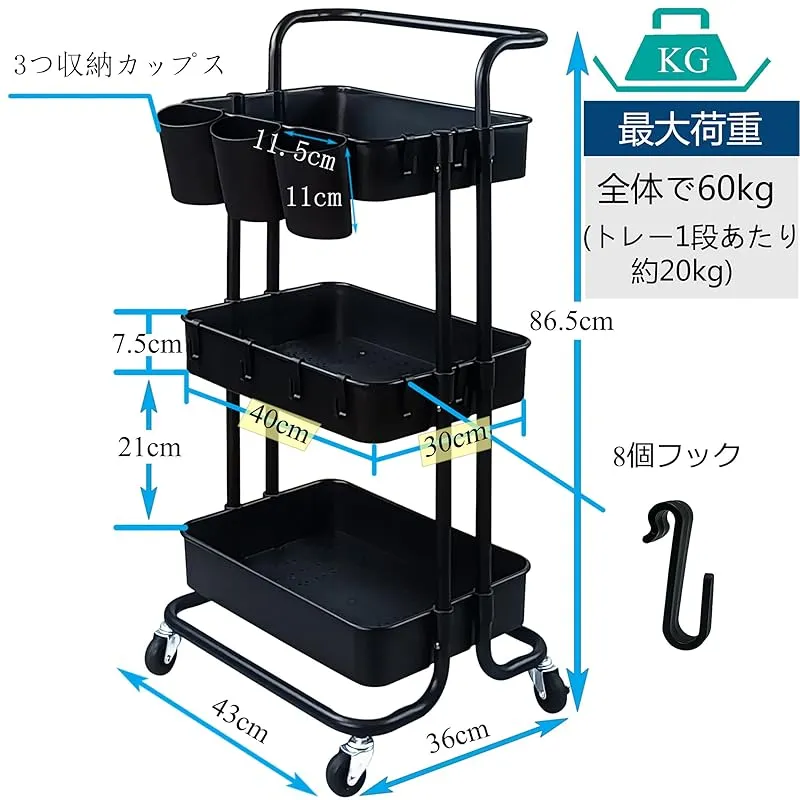 【サイズ&素材】約幅43×奥行36×高さ87;耐荷重60KG;重量約4KG。このかートのフレーム部分は高品質の炭素鋼で作られており、重いものでもしっかり支えます。バスケットはABS防錆材質、通気性がよく、手洗いしてお手入れも簡単。防湿粉体塗装仕上げで木製より、サビにくい加工水回りでもご安心いただけます。