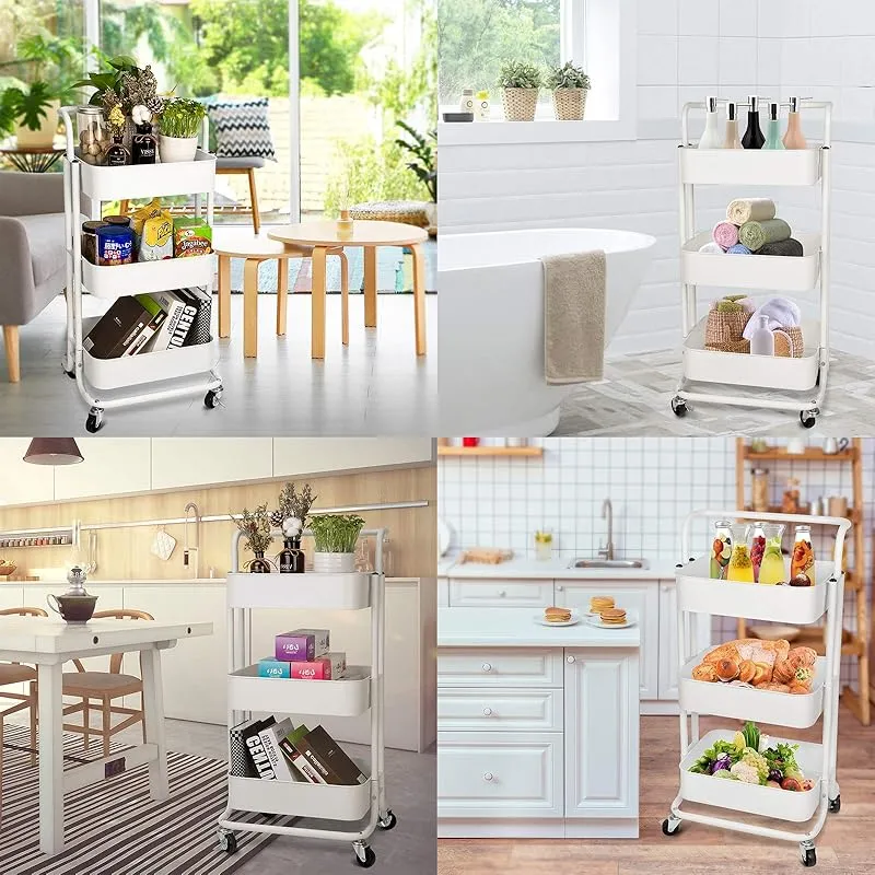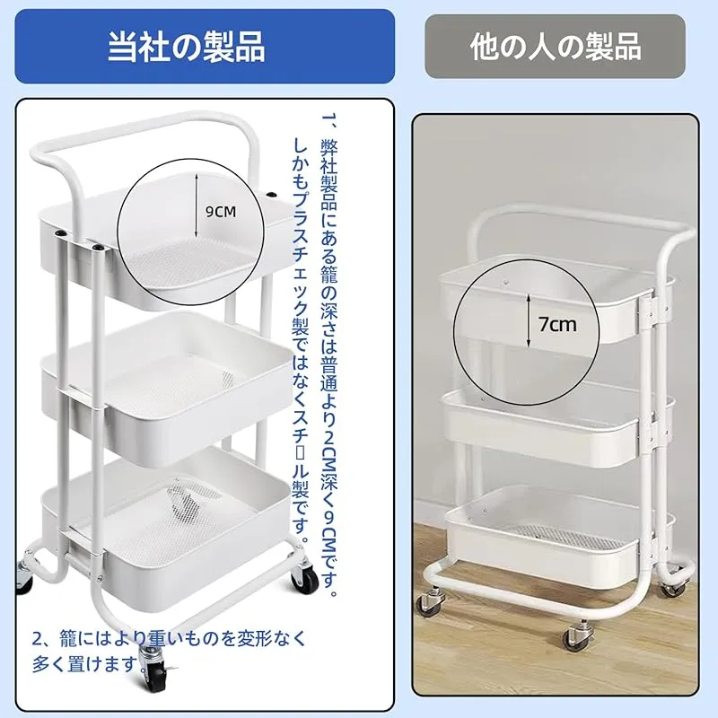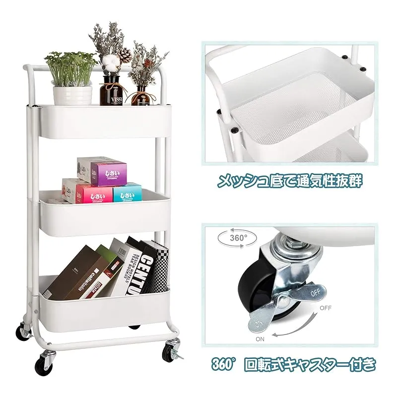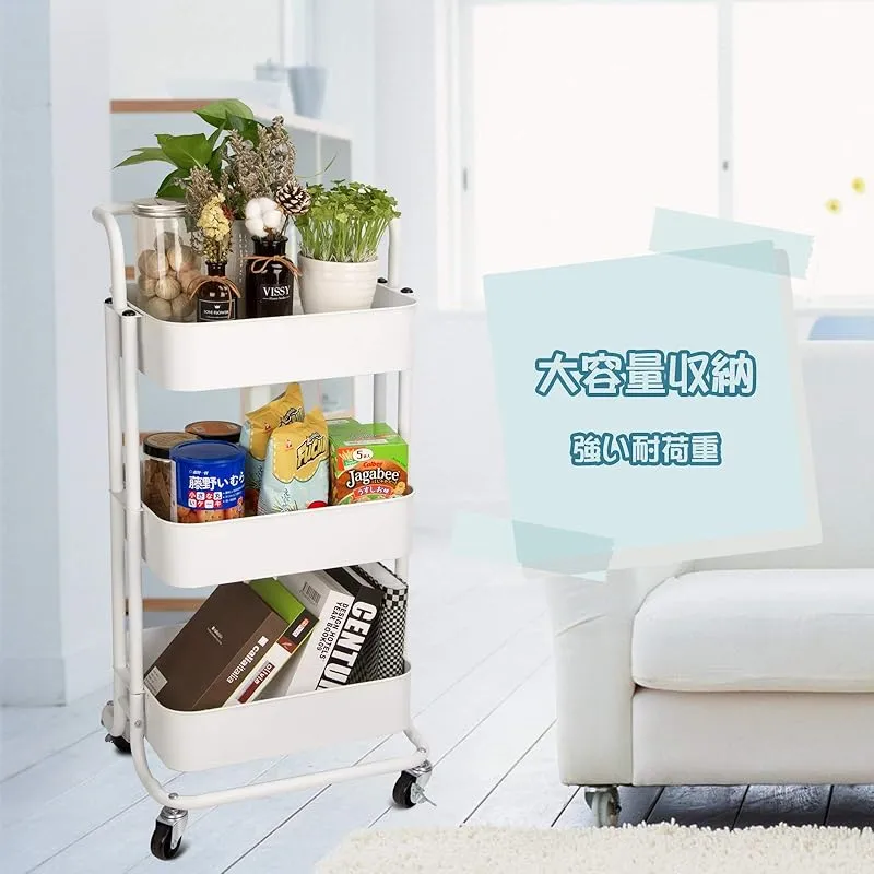 【さまざまな場所で活躍】 使いやすい三段ラック構造で収納力抜群。 キッチン用品・調理器具・食品・日用品・小物類・本・雑貨など、散らかりがちなアイテムをまとめて整理できます。 キッチン、リビング、洗面所、オフィス、倉庫など幅広いシーンに対応します。