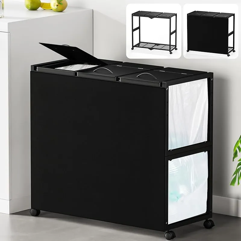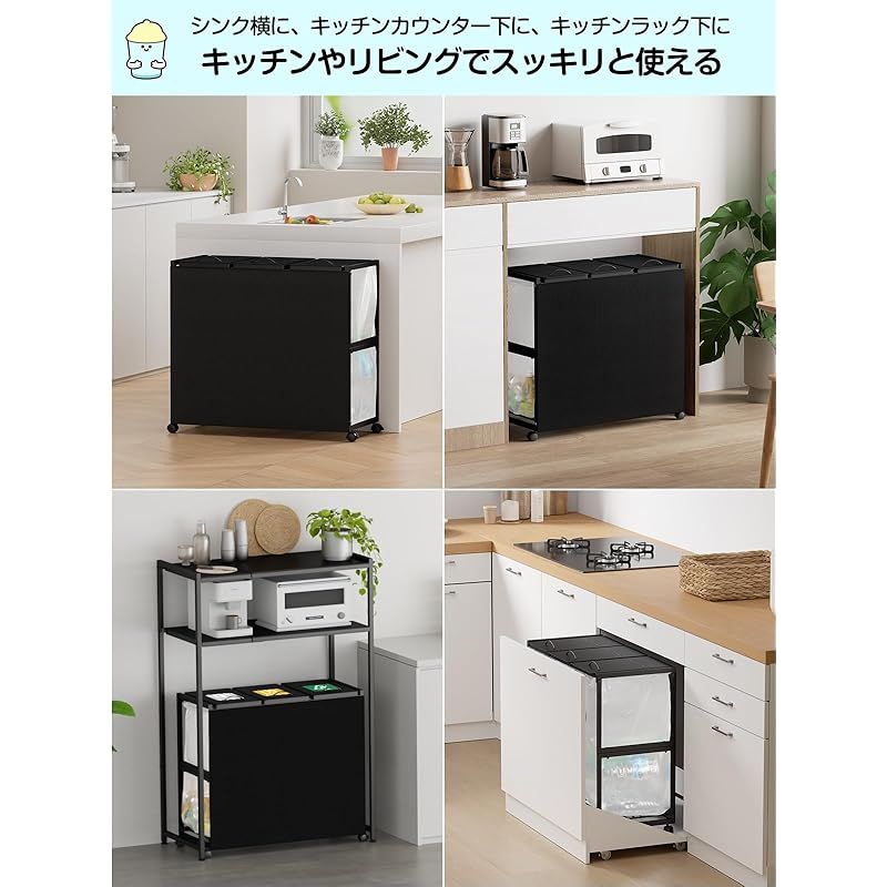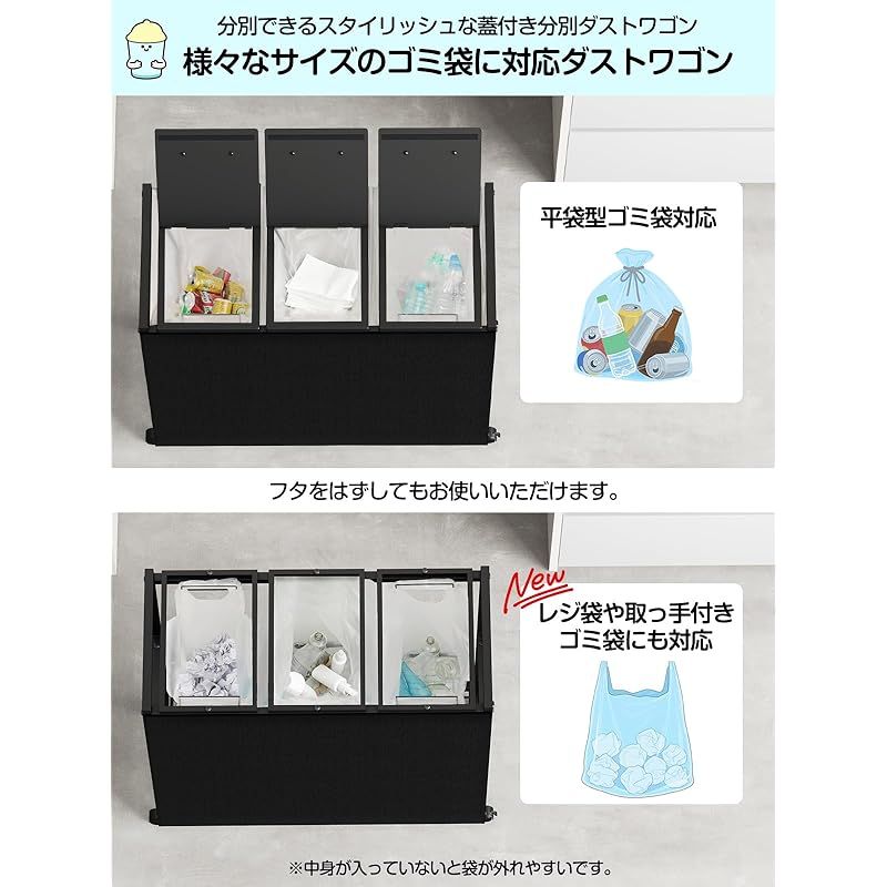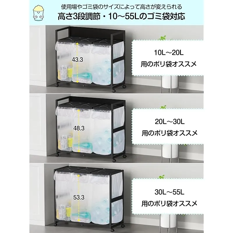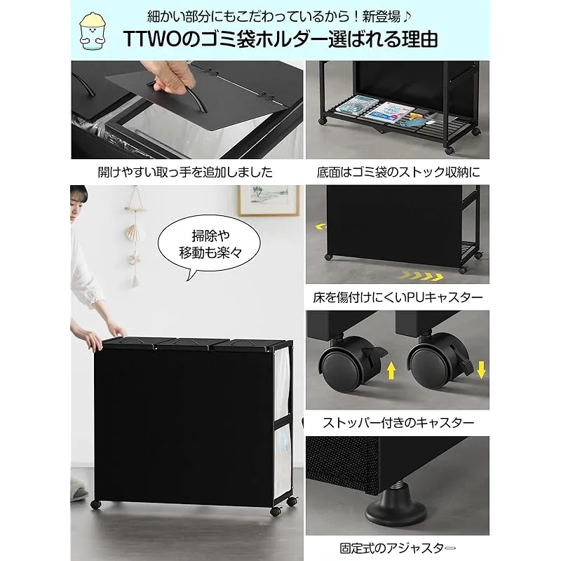 TTWO ゴミ袋ホルダー 3分別×45L 平袋・U型袋両対応 ダストワゴン ゴミ箱 マグネット式目隠しカバー ふた付き 高さ調整 10L~55Lゴミ袋対応 ゴミ箱ホルダー ゴミ袋スタンド ポリ袋ラック レジ袋スタンド リサイクルスタンド ゴミ捨て簡単 エコ スリム キッチン 台所 リビング オフィス キャスター/アジャスター付き