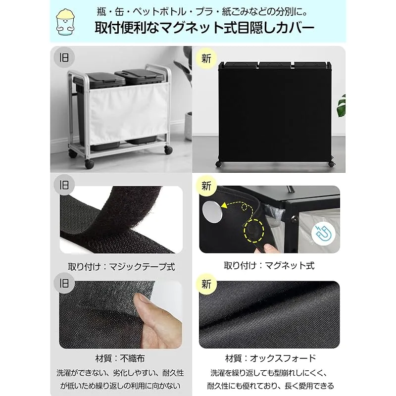 【マグネット式目隠しカバー】前面に目隠しカバーがあり、ゴミが見えにくくなっています。TTWO のゴミ袋ホルダーを選んだ理由:当社製品はマグネット式オックスフォードを使用し、洗濯可能で型崩れしにくく、耐久性に優れ長期使用できる上、使いやすい。従来品はマジックテープ式不織布を使用し、水洗い不可で劣化しやすく、耐久性が低く繰り返し使用に向きません。
