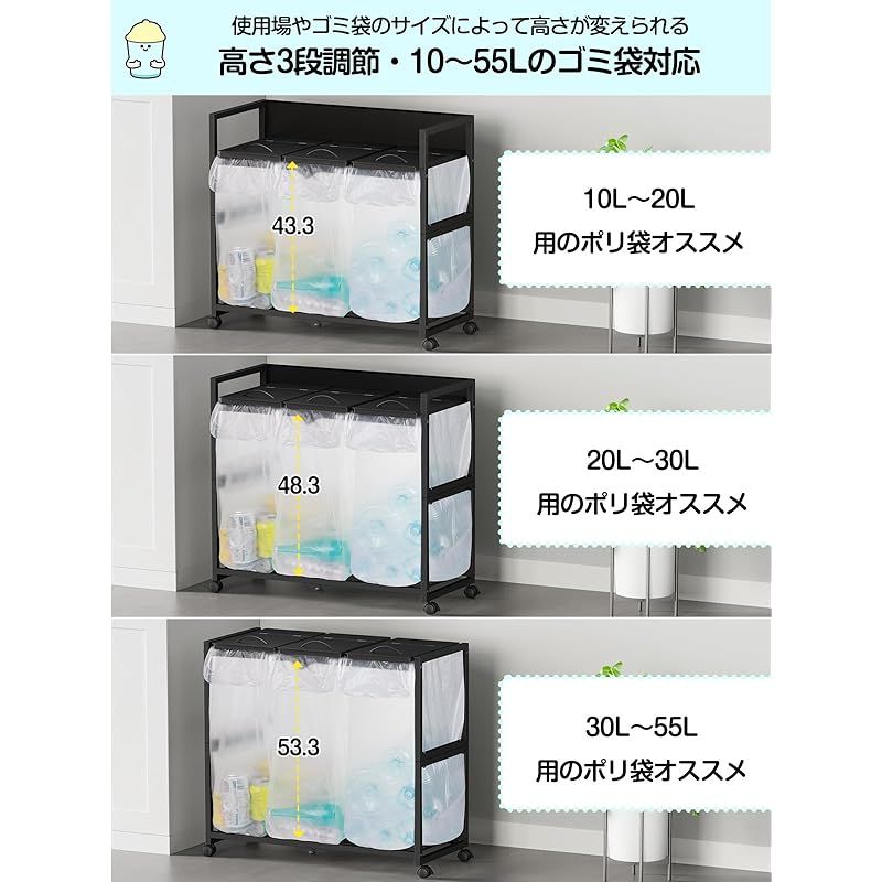 【高さ3段調整ゴミ袋スタンド】高さ3段(5cmピッチ)で調節可能なので、ゴミ袋のサイズやキッチンスペースに合わせてぴったりサイズで設置できます。10L、20L、30L、45L、55Lのポリ袋やレジ袋に幅広く対応。外枠がないので、レジ袋の容量いっぱいにゴミを捨てることができる。汚れやゴミ箱に付くニオイなどを気にする必要がなく、洗う手間もかかりません。機能性抜群のゴミ箱で毎日をもっと快適に。