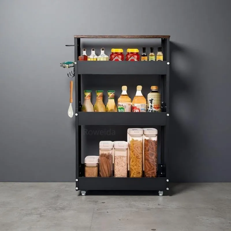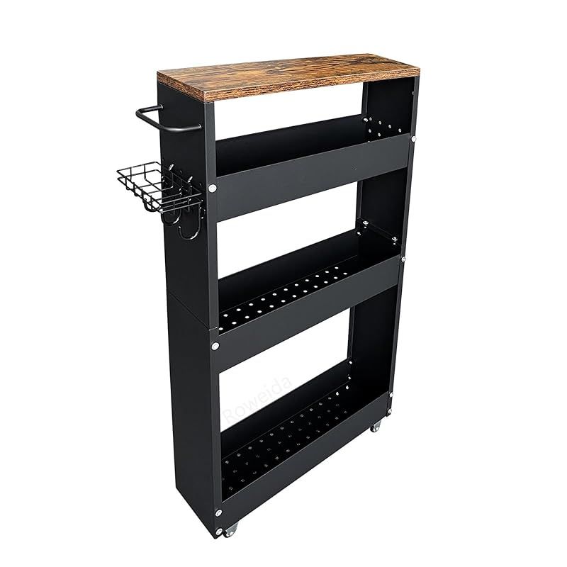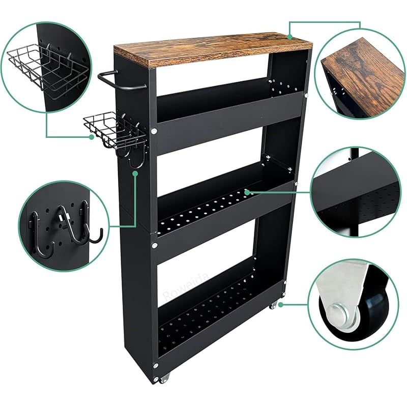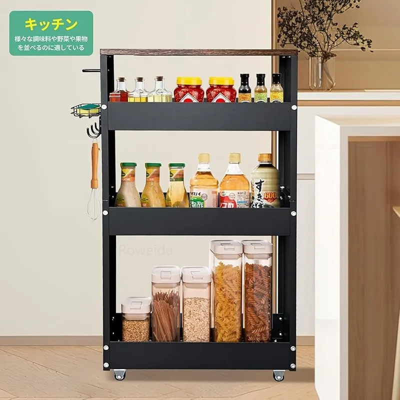 Roweida キッチンカートは、わずか幅13cmのスリム設計で冷蔵庫横や洗濯機サイドなどの狭い隙間にもピッタリ収まる4段モバイルラック。大容量のオープン棚と木製天板でキッチンスパイスや洗濯用品をスッキリ整理でき、するキャスター付きで移動もラクラク。防錆コーティングの頑丈なメタルフレームで湿気多い浴室でも安心。工具不要の簡単組み立て設計で、女性一人でもで完成!