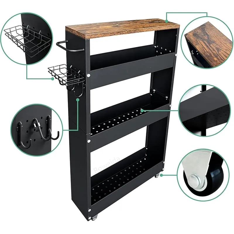 さまざまな場面に対応 この細長い隙間収納棚はさまざまなシーンに適しており、製品本体には取っ手、4つの車輪、3つのフックがあり、出し入れが便利で、キャビネットと冷蔵庫、洗濯機と乾燥機、机と壁などの間の狭い空間(幅13 cmのみ)に最適です