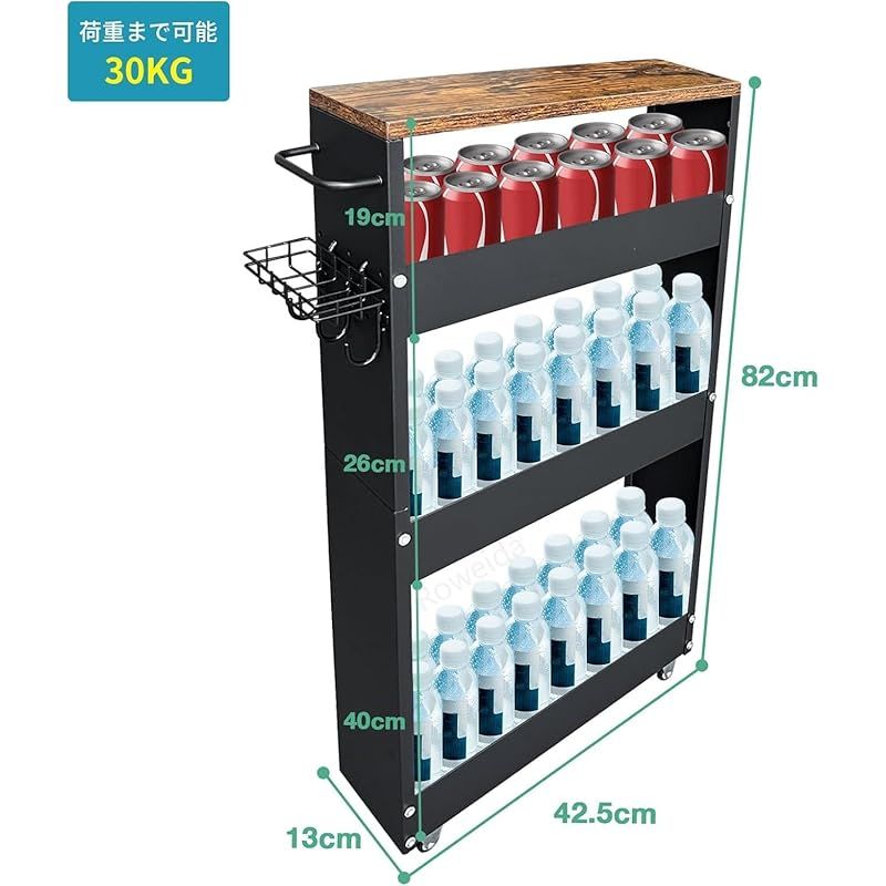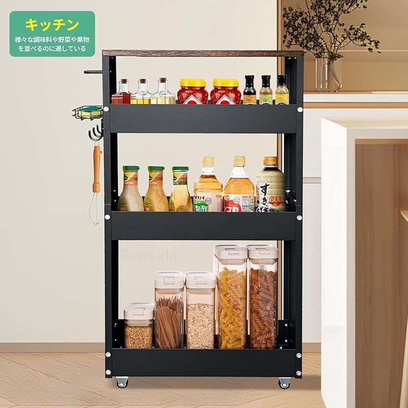 商品名:Roweida キッチンワゴン隙間収納スリム13 cm 移動式隙間ラック 冷蔵庫横 洗面所 ラック 隙間棚 4段 洗濯機横 スリムワゴン 細い棚 調味料棚 メタルフレーム木製天板 ブラック