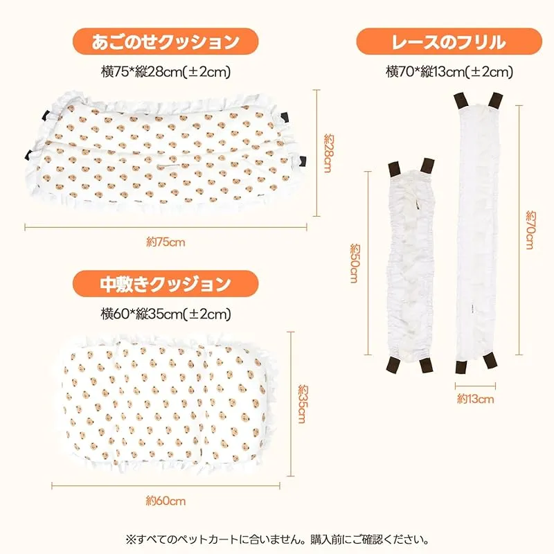 【商品仕様】クッション本体サイズ:約60cm × 35cm、あごのせクッションサイズ:約75cm × 28cm。すべてのペットカートに対応しているわけではございませんので、ご購入前にお手持ちのカートのサイズを必ずご確認ください。ペットカート本体は付属しておりませんので、カート本体は別売りとなります。お間違いのないようご注意ください。