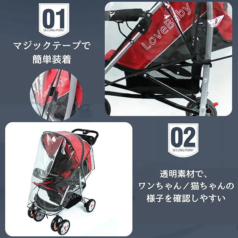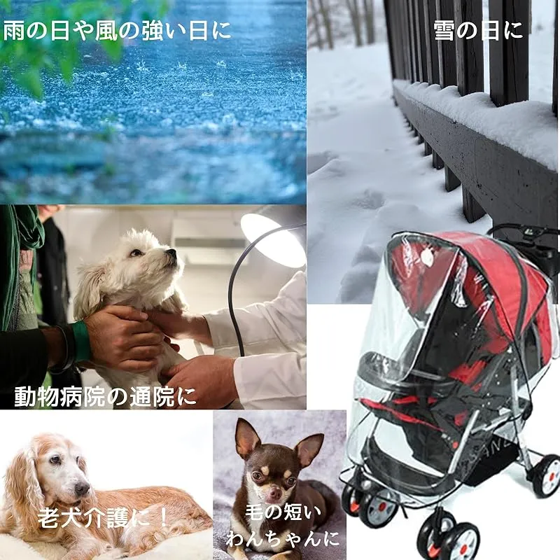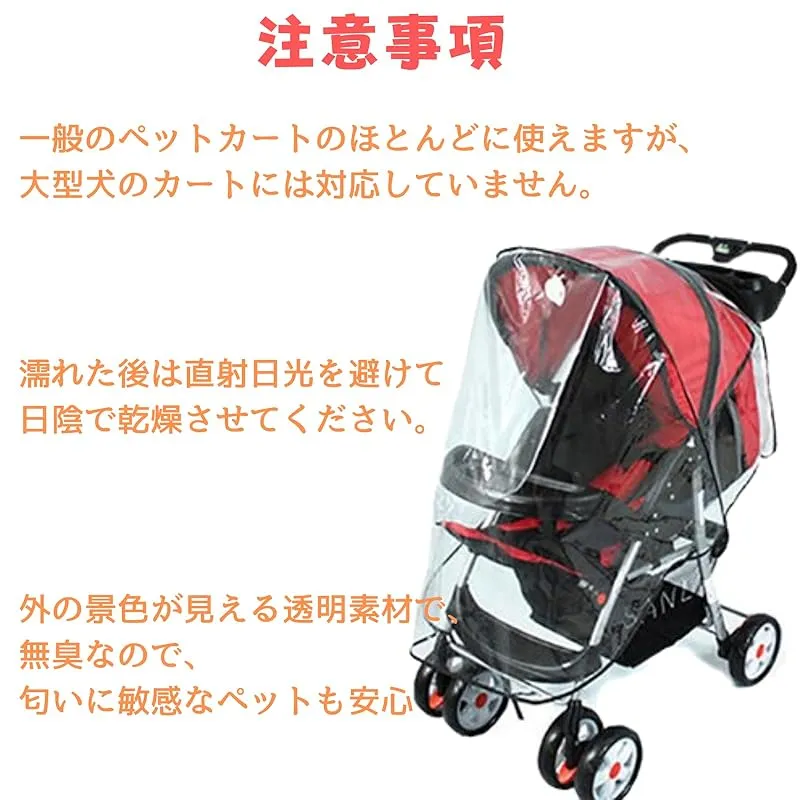 【ペットカートカバー】防雨防寒ペットカートカバー、散歩や介護に最適、簡単装着、透明素材、無臭、やわらかい、大型犬不可。