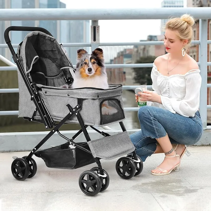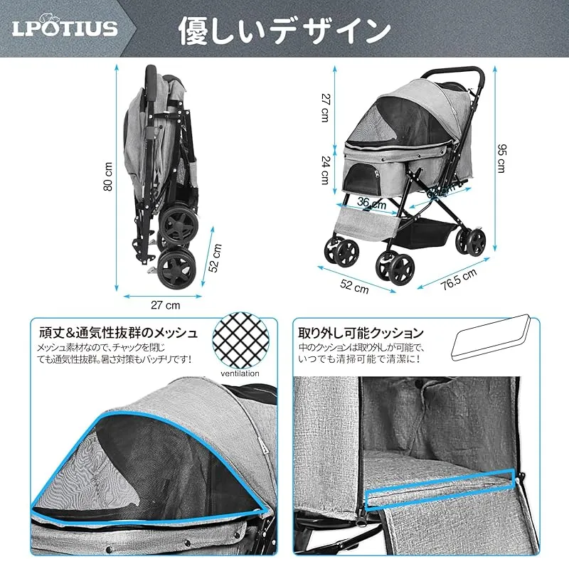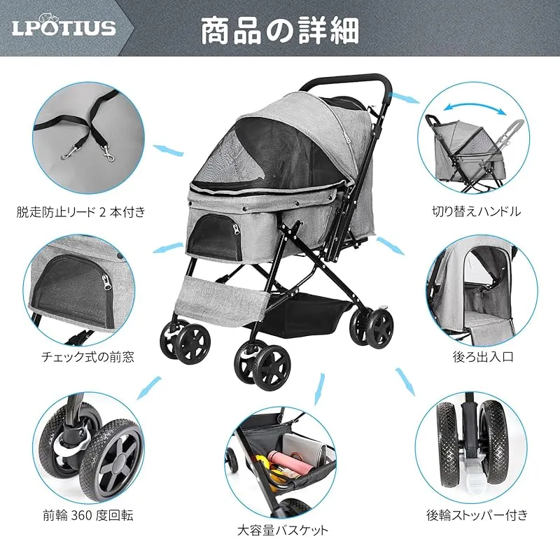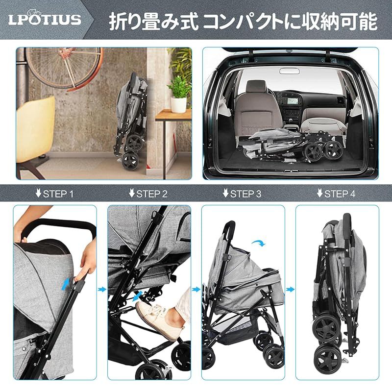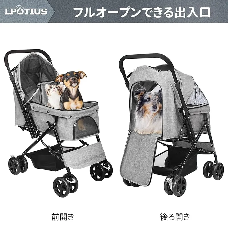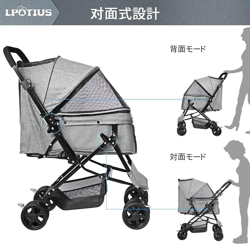 商品名:LPOTIUS ペットカート 軽量 折りたたみ 対面式 2way 犬用ベビーカー 猫バギー 4輪 前輪360度回転 後輪ブレーキ付 中型犬 小型犬 多頭用 猫犬兼用 老犬 お出かけ 通院 介護用 多機能 ペットバギー ドッグカート 耐荷重20KG (グレー)