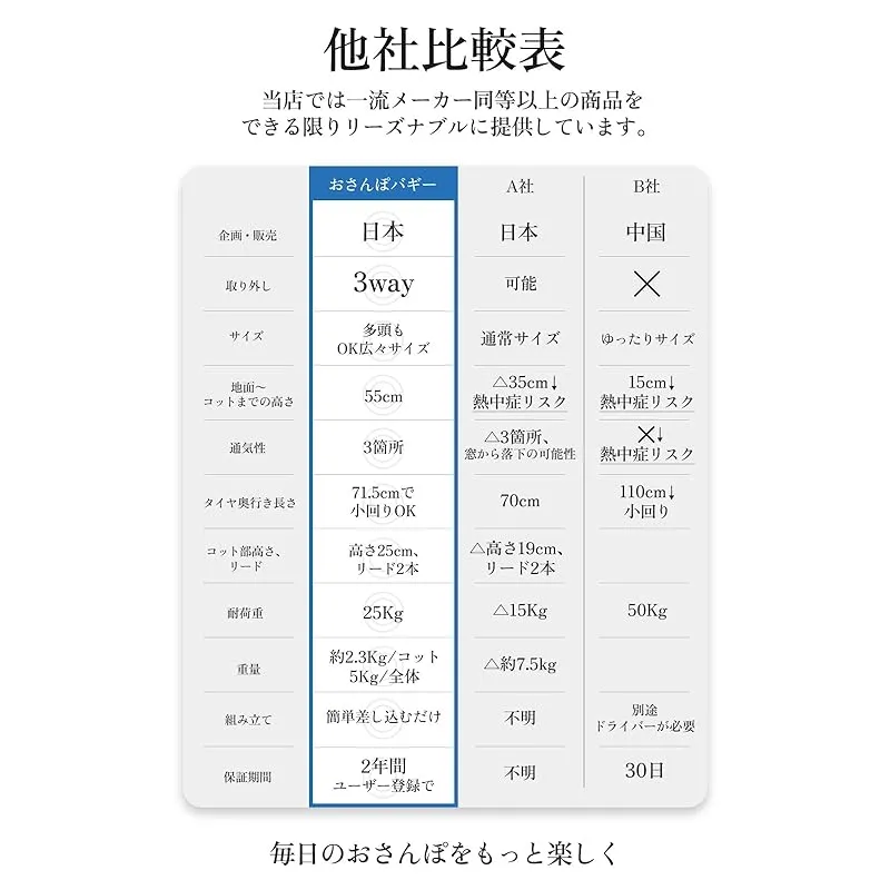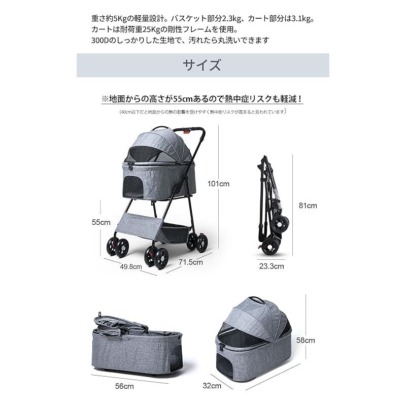 【軽量でコンパクトな設計】 おさんぼバギーは、ベビーカーにも使われる高強度アルミフレームを採用しながら、耐荷重25kgを実現し、軽量化に成功しています。折り畳み式でコンパクトに収納でき、日々のお散歩がより快適で安心して利用できます。300Dオックスフォード生地と高強度PUタイヤにより耐久性と軽量性を両立し、大口径タイヤで振動吸収もバッチリ。使用時は幅49×奥行71×高さ101cmですが、折り畳み時はさらにコンパクトになります。全体をアルミフレームで組み上げ、重量わずか5kgの軽量ボディを実現。女性でもラクラク操作可能で、耐荷重25kgと多頭飼いにも対応します。