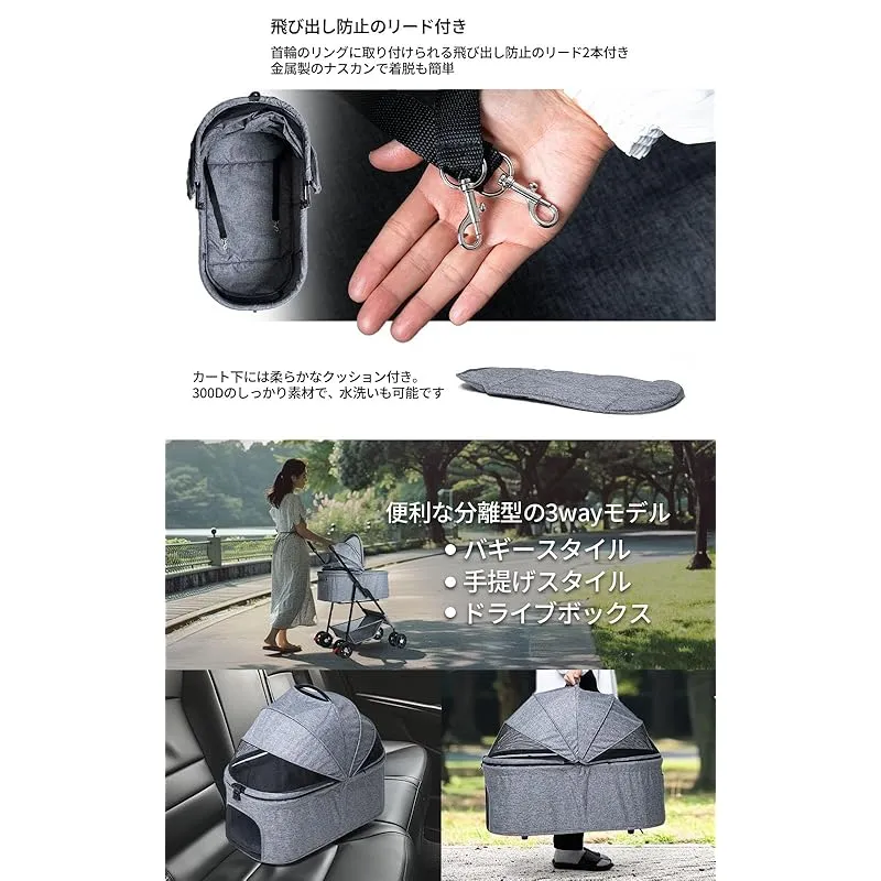 【安全性と快適性の高い設計】 360度回転する前後輪と、安定感のあるブレーキ付き後輪で、どんな地形でも安心して移動できます。大口径の振動吸収タイヤとサスペンションを採用し、路面からの振動を抑えてペットが快適に過ごせるよう配慮されています。分離型デザインでペットの乗り心地も快適で、飛び出し防止リードでより安全に使えます。さらに耐久性と安定性に優れたフレーム設計で、ペットの安全を第一に考慮。通気性の良いメッシュカバーで夏場も快適、足踏みブレーキで停止もスムーズです。飼い主様とペット双方にとって安全性と快適性を兼ね備えた、理想的な選択肢となるペットカートです。