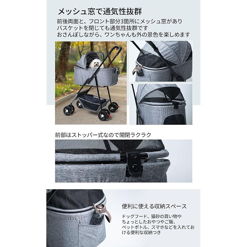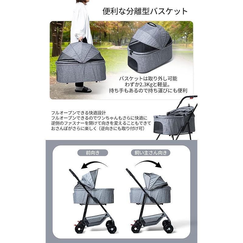 【楽しく快適なお出かけをサポート】 360度回転する前後輪でどんな場所でもスムーズに移動可能。開閉自由な屋根で、ペットとコミュニケーションを取りながら一緒に外の景色を楽しめます。最大180度の開閉で開放感があり、ビューウィンドウ付きでペットの安心感も高まります。さらに分離型デザインなので、ペットキャリーとしても使え、お出かけ先でのペットとの遊び方が広がります。軽量で耐久性に優れたフレームと生地で、どんな冒険にも対応できます。ペットとの時間をより豊かにするアイテムとして、毎日のお散歩がもっと楽しく快適になることでしょう。