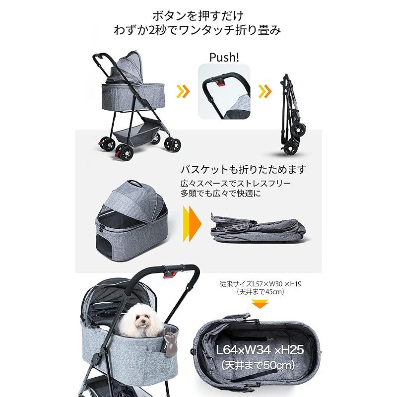 【利便性に富んだ機能性】 ワンタッチで簡単に自立型に折り畳めるデザインで、玄関や車のトランクにもすっぽり収まります。伸縮ハンドル付きで持ち運びも楽々で、旅行から日常使いまで幅広く活躍。わずか2秒で折り畳み可能で収納スペースを取らず、伸縮ハンドルでどこへでも楽々移動できます。収納バスケットと背面ポケットがあり、ペット用品からお買い物グッズまですべてを一手に管理できる便利さです。また、屋根の開閉が自由自在で、ペットの乗せ降ろしが簡単。ビューウィンドウ付きで飼い主とペットのコミュニケーションも取りやすく、出かけるたびに快適な時間を提供します。