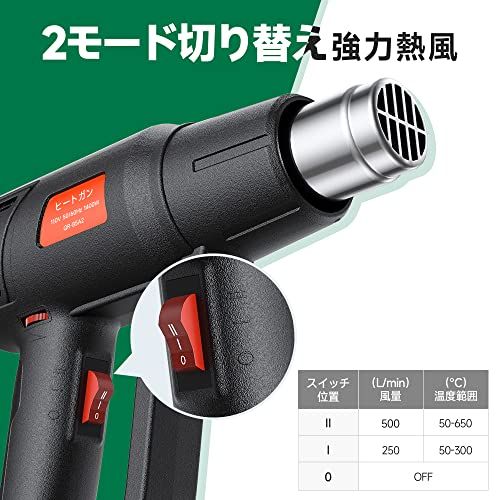 【無段階調温2段階風量】ヒートがんは風量切替スイッチと無段階温度調整ダイヤルを同時に備えています。作業に合わせた細かい温度を簡単にコントロールできます。スイッチを利用してヒートがんの強風、弱風モードを切り替えできます。必要に応じて、無段階温度調整ダイヤルを回すとヒートがんの温度を自由に調整できます。弱風モード「?」:風量250L/min、温度範囲50~300。強風モード「?」:風量500L/min、温度範囲50~650。※ダイヤルを左に回して温度がだんだん下降します。右に回して温度がだんだん上昇します。