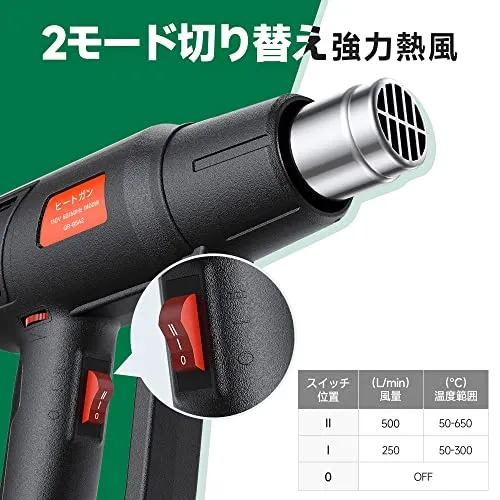 【安全安心の日本規格】日本PSE認証を取得済み、安全かつ安心してご使用いただけます。電源:AC110V 50/60Hz共用、消費電力:最大1400W ※日本の一般家庭用電圧に使用できるヒートガンです。電源コードの長さ(コードのみ):約1.6m(ヒートガンの本体から電源プラグまでの長さは約1.8mです。ご了承ください。)※ヒートガンを初めて使用する場合は、少量の白霧が発生する場合がございます、ご安心ください。