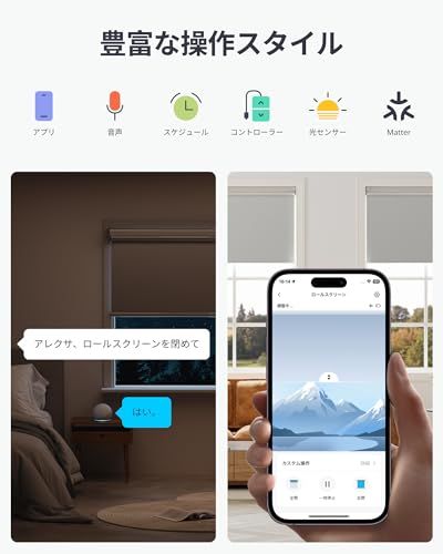 【多彩な操作方法で、誰でも簡単に操作できる】スマホのアプリ、スマートスピーカーからの音声操作、リモコン、遠隔操作などさまざまな操作方法に対応。例えば、タイマーを設定して、朝は自動で、就寝前は音声で手軽にロールスクリーンを開閉できます。また、複数台所持している場合、ロールスクリーンのグループ化設定(最大8台)を行うことで、複数台の開閉操作を同時に実行可能です。