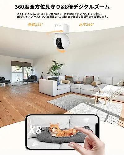 【新発売&4K(800万)&360度全方位見守り&家族やペットの見守り】 BOIFUNは23年夏に進化のペットカメラを新発売しました。 犬・猫の留守番の様子を見守りたい飼い主さんにおすすめするペットカメラです。?重要な解像度・4Kの時代へ:ペットカメラは高品質レンズを搭載し、画素は2k、500万から4Kの高画質(800万画素:3840*2160)に進化して、高精細な映像を提供できます。仕事中の休憩時間にペットの姿を見て癒されたいならおすすめです。 ?首振り(パン/チルト)・8倍のデジタルズーム:156超広角レンズおよび水平360、垂直115超静音の回転機能で、全方位から部屋を見ることができ、行動範囲の広いペットの見守りは大活躍です。8倍のデジタルズームが搭載して、画面を自在に拡大/縮小できて、職場や外出先からスマホでペットの表情まで確認しやすい、ペットの体調が悪い時、すぐに気付けます。BOIFUN見守りカメラは電源コード式なので、他の電子機器と同様に、使用すると熱くなるのは正常な現象です。BOIFUN・ペットカメラの使用はネット環境が必要です。
