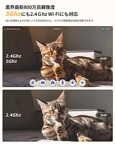 【5Ghzや2.4GhzWiFiの両方とも対応&優れた暗視機能&双方向通話】wifi対応仕様:BOIFUNの4kペットカメラは2.4GhzWiFi、5GhzWiFiにも対応となります。デュアルバンドWi-Fi対応でwifi接続の制限なし。外出先から5Ghzを利用してスマホで映像がスムーズに見えます。優れた暗視機能:防犯カメラは光害のない波長850nm赤外線LEDを搭載し、暗視距離は約12mに達します。HDR技術、光照射環境に適応し、IR-CUTを切り替え自動的に調節、真っ暗でも不審者の顔や服装を確認できるほどの高画質撮影が可能。生活に便利性ア