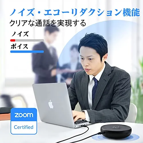【優れた音声処理機能】エコーキャンセリングや残響抑制、ノイズリダクション機能を採用しており、クリアな通話を実現できたスピーカーフォンです。周囲の雑談の音、コピー機・エアコンのノイズ、キーボード打ちの音などを抑制でき、発言者の音を明瞭に展開できます。ストレスのないオンライン会議をサポートします。高品質な通話を保証する「Zoomミーティング」の公式認証を取得し、製品本体のミュートボタンとZoom上のミュート表示が連動するようになります。