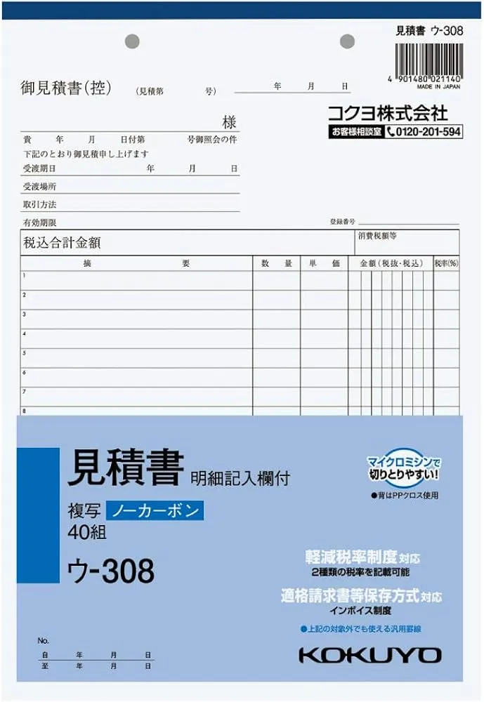 コクヨ 軽減税率・インボイス制度対応 NC複写簿 ノーカーボン見積書(明細記入欄付き )B5タテ型 12行 40組 ウ-308×10冊セット