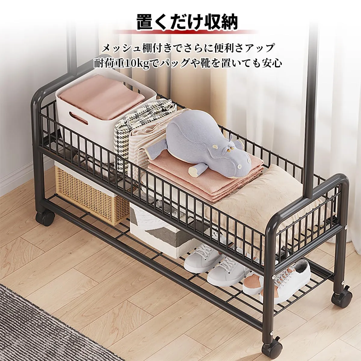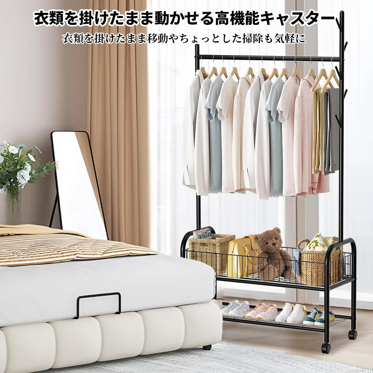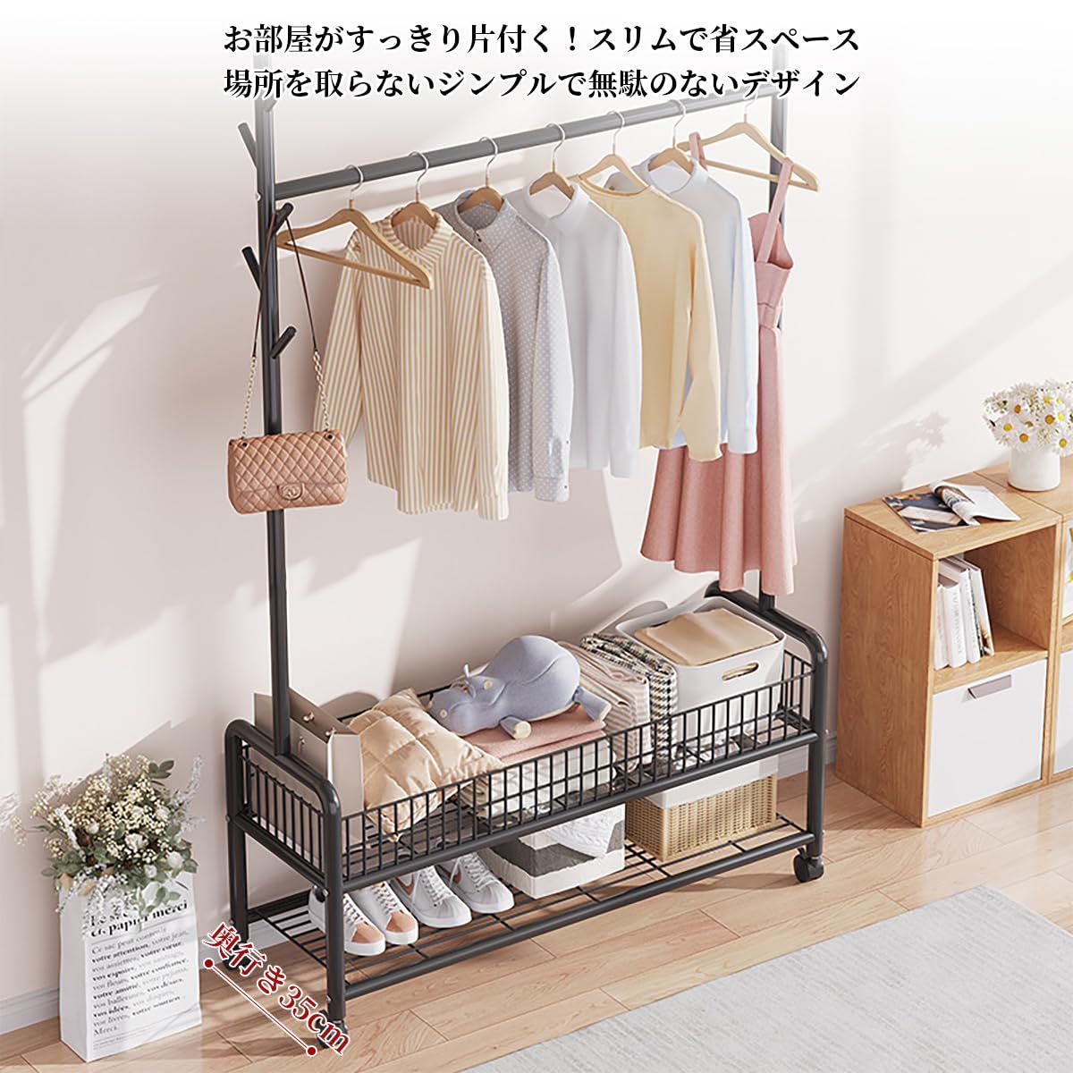 【一台二役】狭いお部屋でもスペースを有効活用し、洋服を掛けるのはもちろん、雨の日や、花粉の時期などは、部屋干し用のハンガーとして使っても便利です。衣類収納と室内干し、一台二役で使えます。大容量の2段バスケットで、洋服と小物をまとめて収納出来るのでおすすめです!