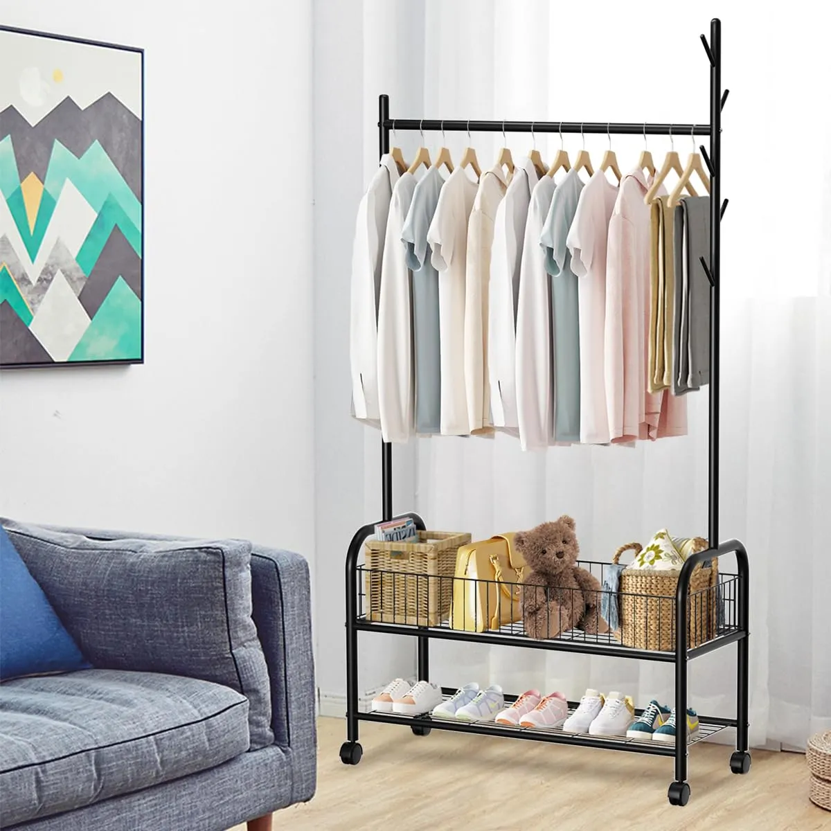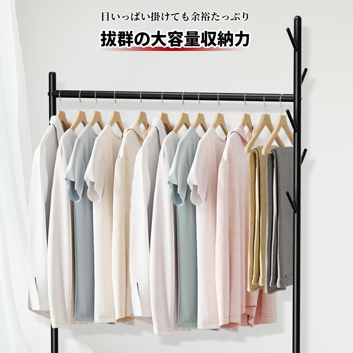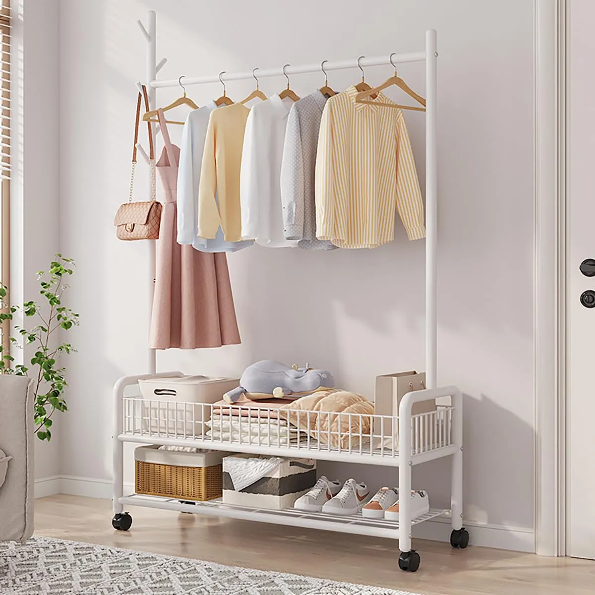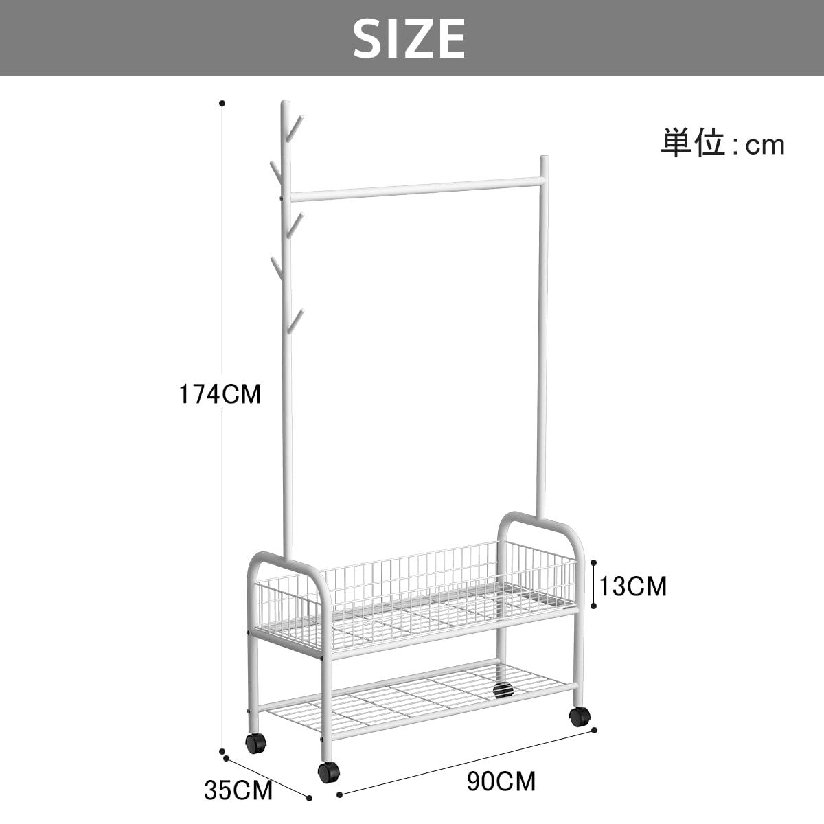 【一台二役】狭いお部屋でもスペースを有効活用し、洋服を掛けるのはもちろん、雨の日や、花粉の時期などは、部屋干し用のハンガーとして使っても便利です。衣類収納と室内干し、一台二役で使えます。大容量の2段バスケットで、洋服と小物をまとめて収納出来るのでおすすめです!