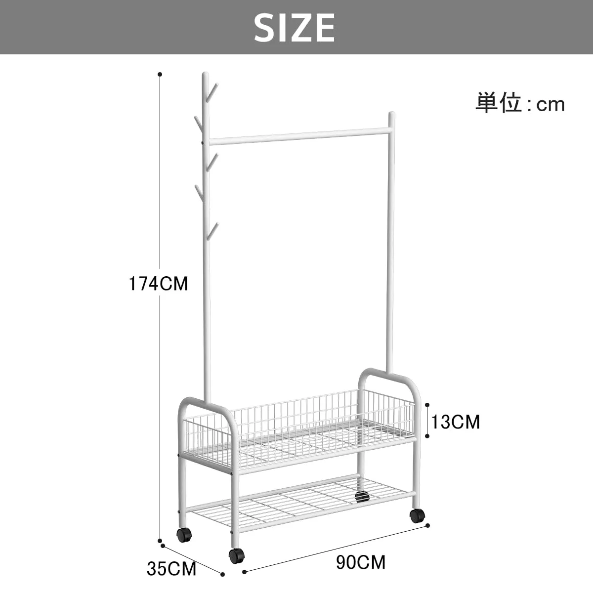 【商品仕様】本体サイズ:幅90×奥行35×高さ176cm 本体重量:約4.25kg、耐荷重は約50kgまで達していますので沢山の洋服、カバン等を掛けられます。