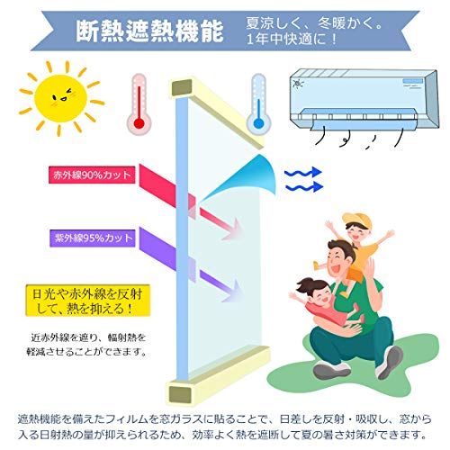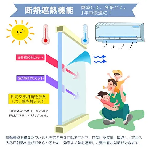 【断熱遮熱機能】この窓用フィルムが赤外線(太陽熱)を約90%反射吸収し、室内に入る熱を抑え、冷房で涼しくなった室温を保つ事ができます。断熱フィルムは室内の暖房を外に逃がさず、外からの冷気の侵入を抑える効果があります。室内の温度差を小さくし、冷暖房設定温度の緩和が可能になり、電気代削減に繋がります。